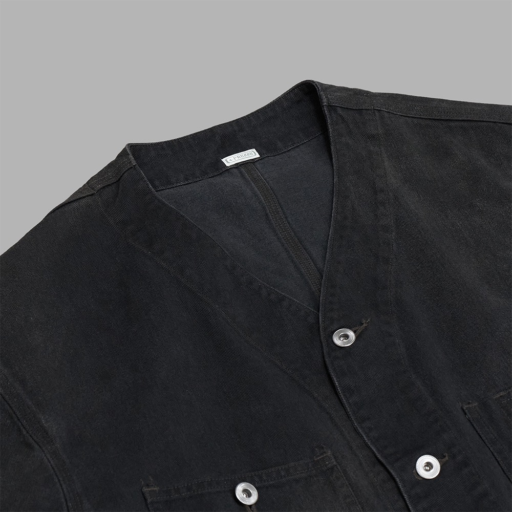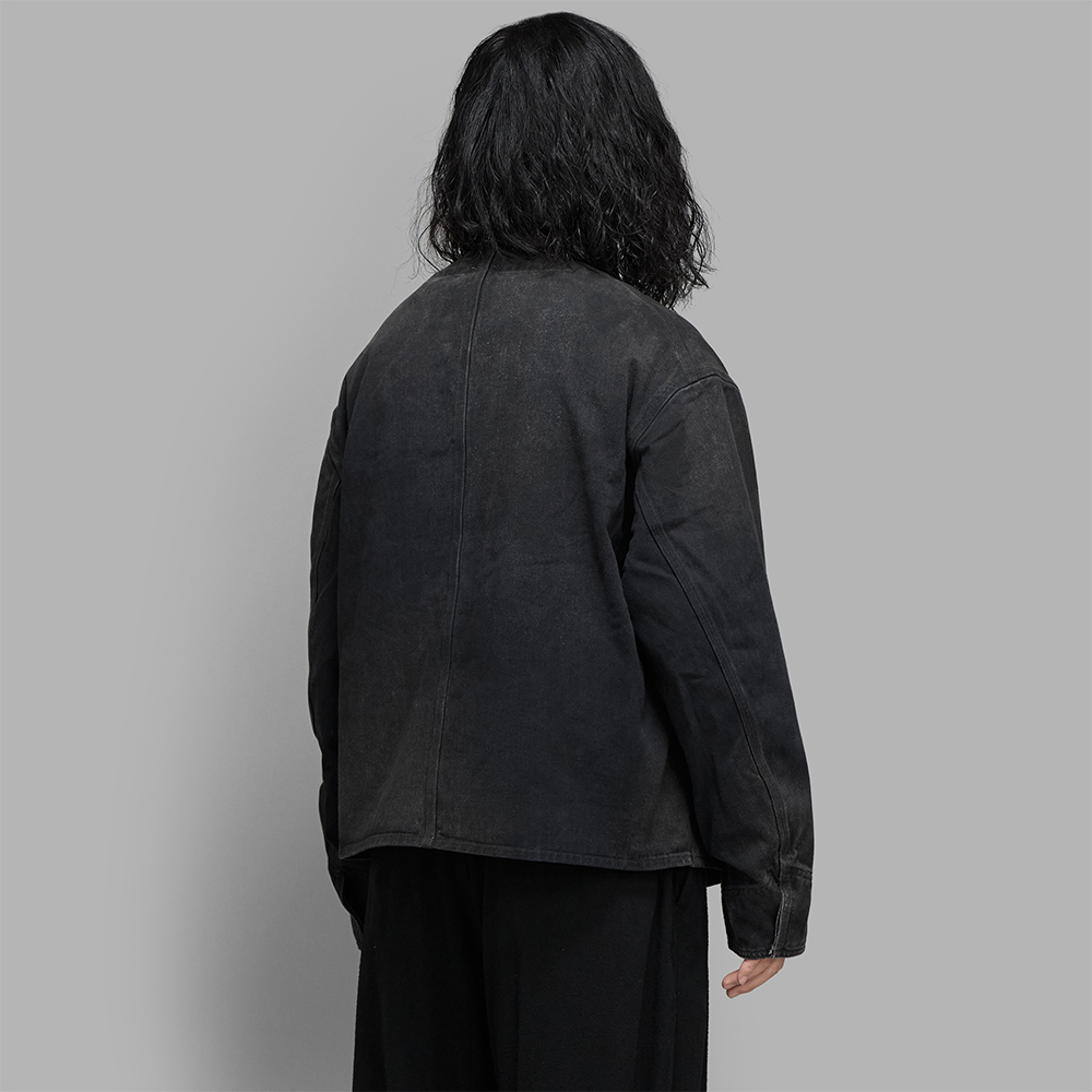 長い年月を経たヴィンテージさながらの生地の質感や表情を、職人の手作業によって表現しています。程よく色褪せたブラックデニムの色合いは、スタイリングにも自然と馴染み、さまざまなアイテムにあわせられる汎用性の高さも魅力です。カーディガンのような感覚で羽織ることができ、軽いアウターとしてはもちろん、冬場にはインナージャケットとしても活躍します。