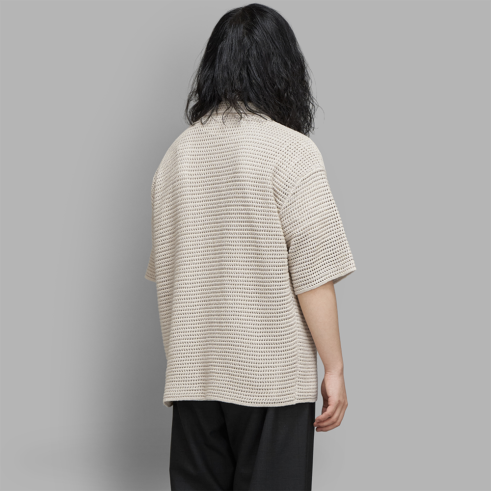 糸をかぎ針編みのようなメッシュ組織で編み上げた繊細で表情豊かな風合いが魅力のニットです。清涼感がありながらも、雰囲気のある着こなしをお楽しみいただけます。また、透け感を活かした、色物のカットソーとのレイヤードもお勧めです。