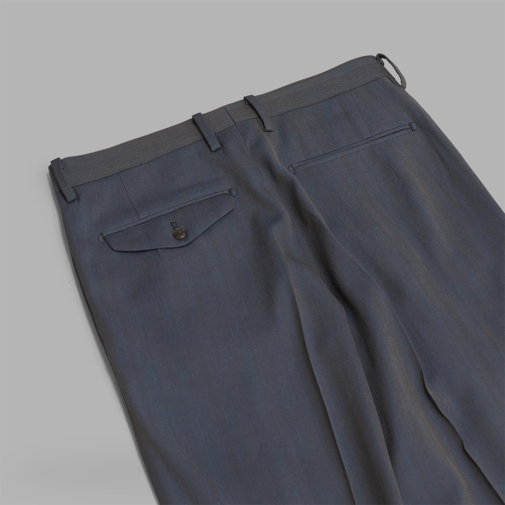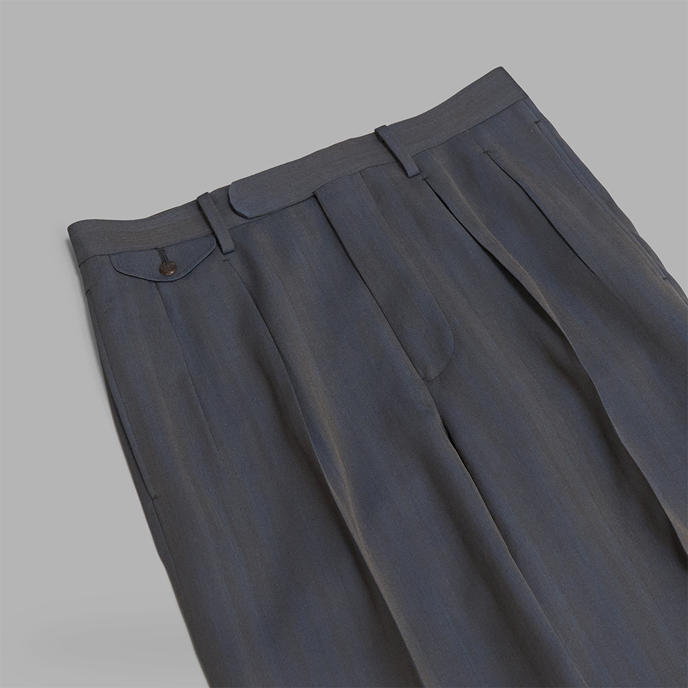 型は、2インプリーツのワイドテーパードで、太すぎない程度にボリュームを出しながら品のある印象にバランスを整えたシルエットです。前立てはジップフライで、中は半裏で仕立てています。