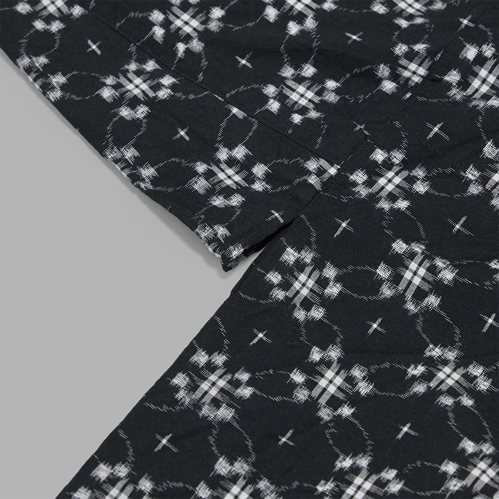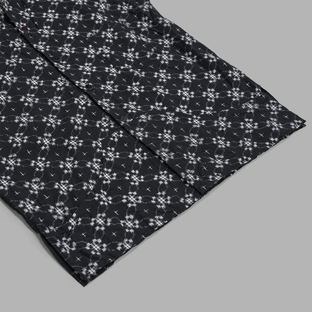 型は、1950年代のワークシャツと着物から着想を得た直線的なパターンを採用しています。全体的に程よくゆとりを持たせつつも、着丈をすっきりさせたサイズバランスで作製されたシャツジャケット型です。前立てのトップボタン部分はボタンではなく、フックのつく仕様です。前面の裾に配されたポケットは機能的に仕切られているだけでなく、デザイン性も兼ね備えています。