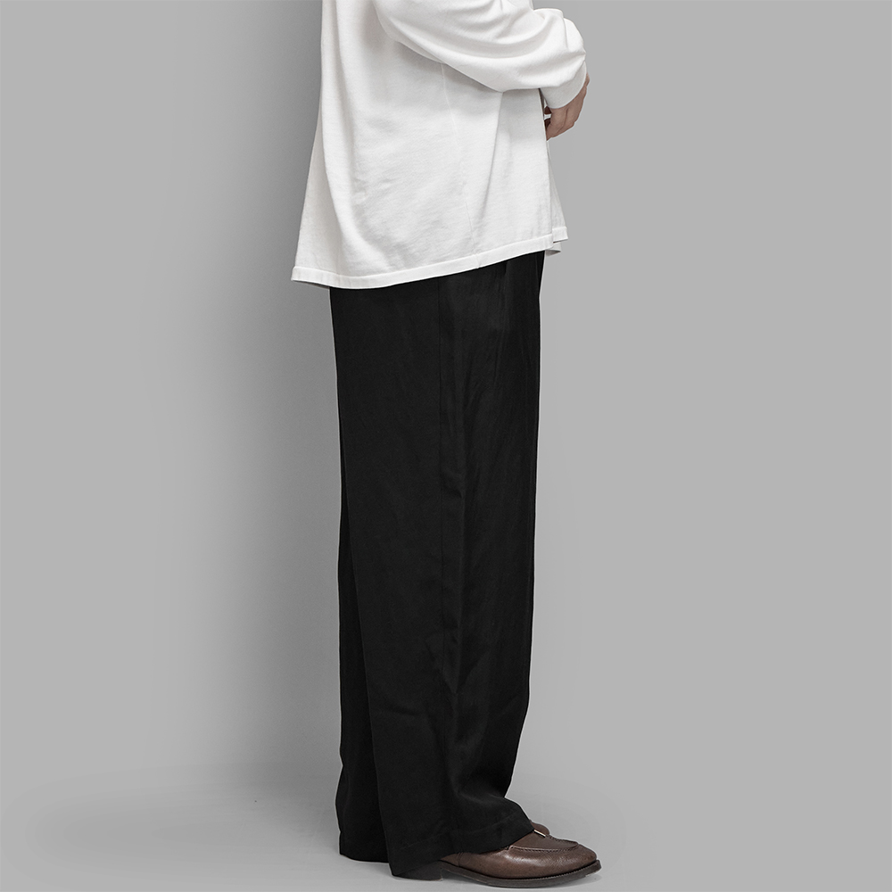 型は、股上やワタリ幅など、全体的に程よくゆったりとしたサイズバランスで製作されたツータックトラウザーズです。バック部分にはイージー仕様を採用し、上品な印象が残るよう全体のバランスや各ディテールを調整しています。前立てはジップフライで、裏地はありません。