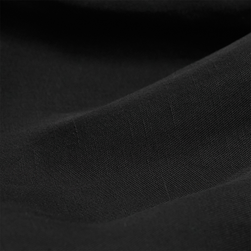 素材は、経糸にヴィスコースレーヨン、緯糸にリネンを使用したツイル生地を使用しています。ヴィスコースの光沢感と落ち感に、リネンのスラブとハリ感が掛け合わさり、上品でありながらエレガントすぎないバランスの良い生地です。また、タンブラーワッシャー加工を施したことによるナチュラルなシワ感もポイントです。