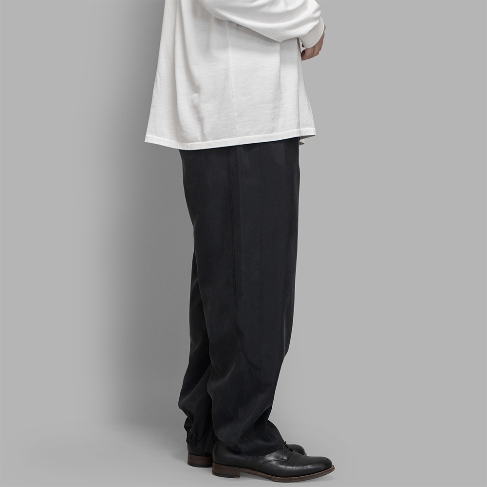 型は、ゆったりとしたストレートに近いシルエットで製作されたイージー仕様のトラックパンツです。股上はやや深くし、程良くリラックス感を持たせ、後ろの裾口のみゴム仕様でミニマルな印象に仕上げています。また、裾口の内側はファスナーが付いており、開閉位置を調整することで、足元に変化をつけることができます。前立ては、トップボタンは無いジップフライの仕様で、裏地はありません。