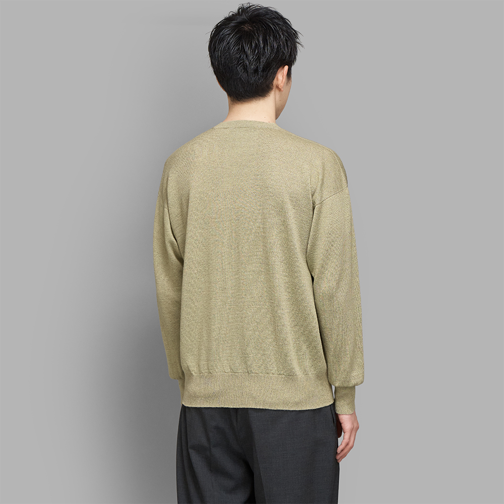 厚みはさほどなく、サマーニットのような感覚で、1枚でもジャケットのインナーとしても使いやすいアイテムです。春夏の定番モデルとしてブランドで展開されているだけあり、バランスの良さと汎用性の高さが魅力です。