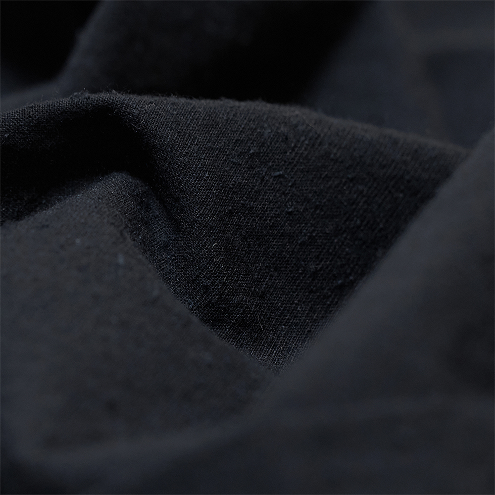 程よいネップ感のあるコットン・シルクの薄手の生地を使用しています。重く感じすぎない絶妙な黒のトーンは、やや薄めの乾いたような色味で春夏のスタイルでも合わせやすい印象です。
