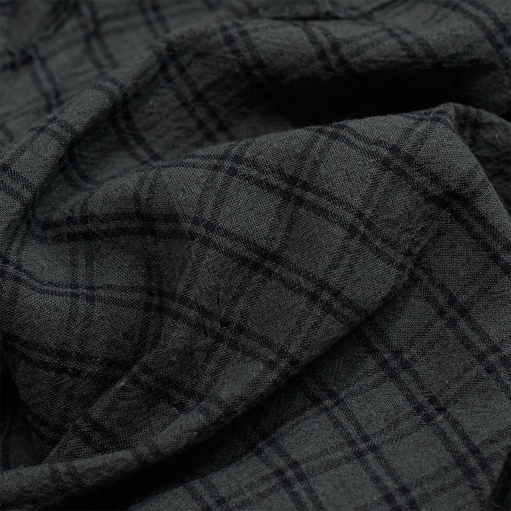 程よいネップ感のあるリネン・コットンの薄手の生地を使用しています。製品での洗いによって、細かなシワが入ることで凹凸が生まれ、シャツのような薄手の生地でありながら重厚感のある生地に仕上がっています。