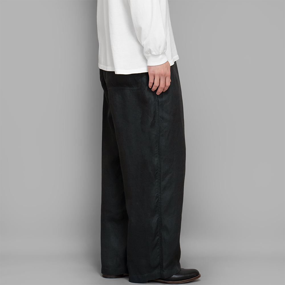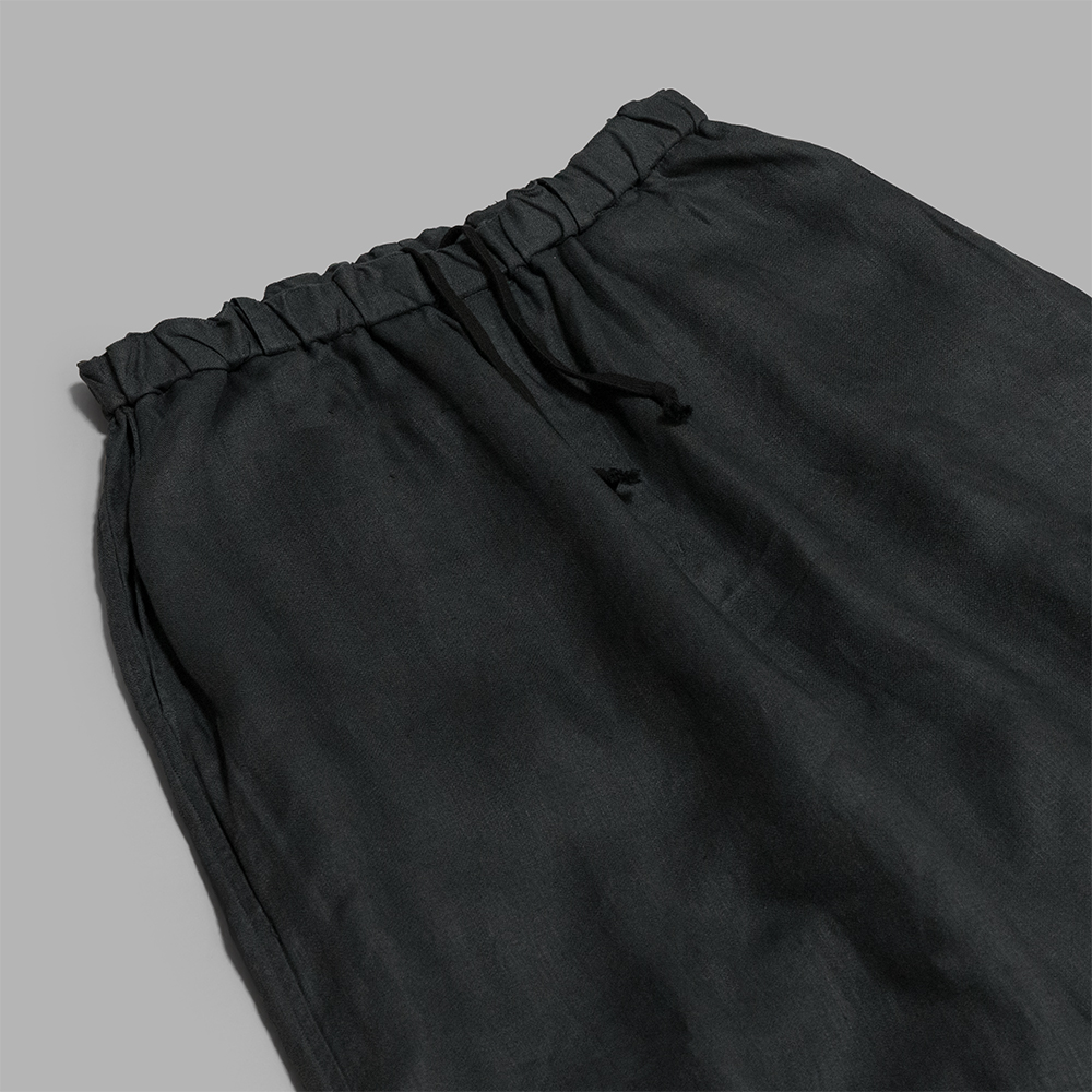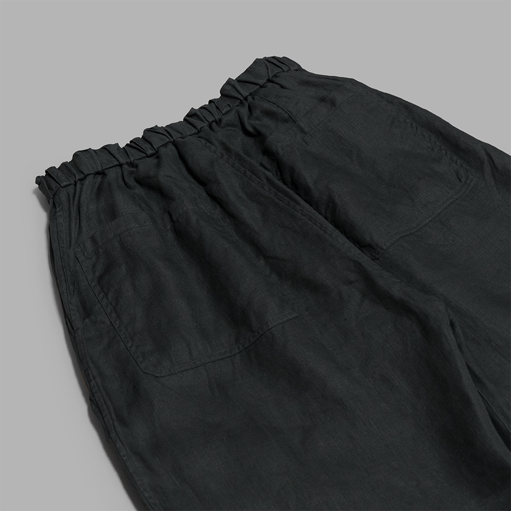 形は裾までストンと落ちるワイドストレートのシルエットです。ウエストはゴム仕様になっており、内側の紐でベルトなしでも快適に着用できますが、ベルトループも配しているため、ポケットをしっかり活用する際などにベルトを使用することも可能です。