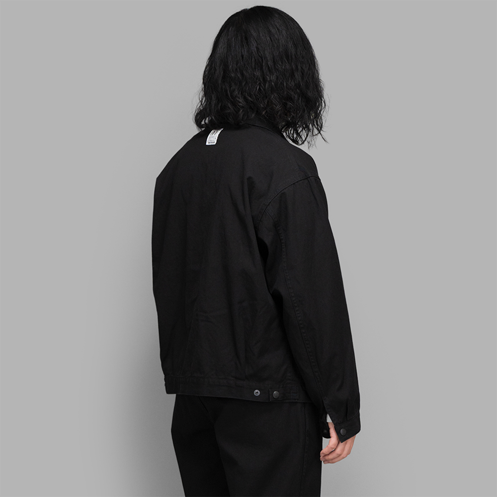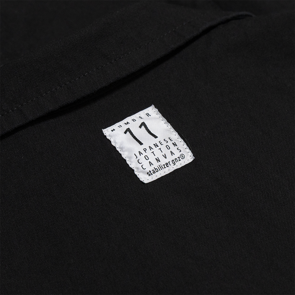 生地は資材やバッグなどに使われる日本製の帆布を使用しています。衣料用として扱いやすい、帆布としては薄手の「11号帆布」にウォッシュを施し、ドライな表情に仕上げていることが特徴です。後身頃には、こちらの表地用に作製されたオリジナルのナンバリングネームが付きます。