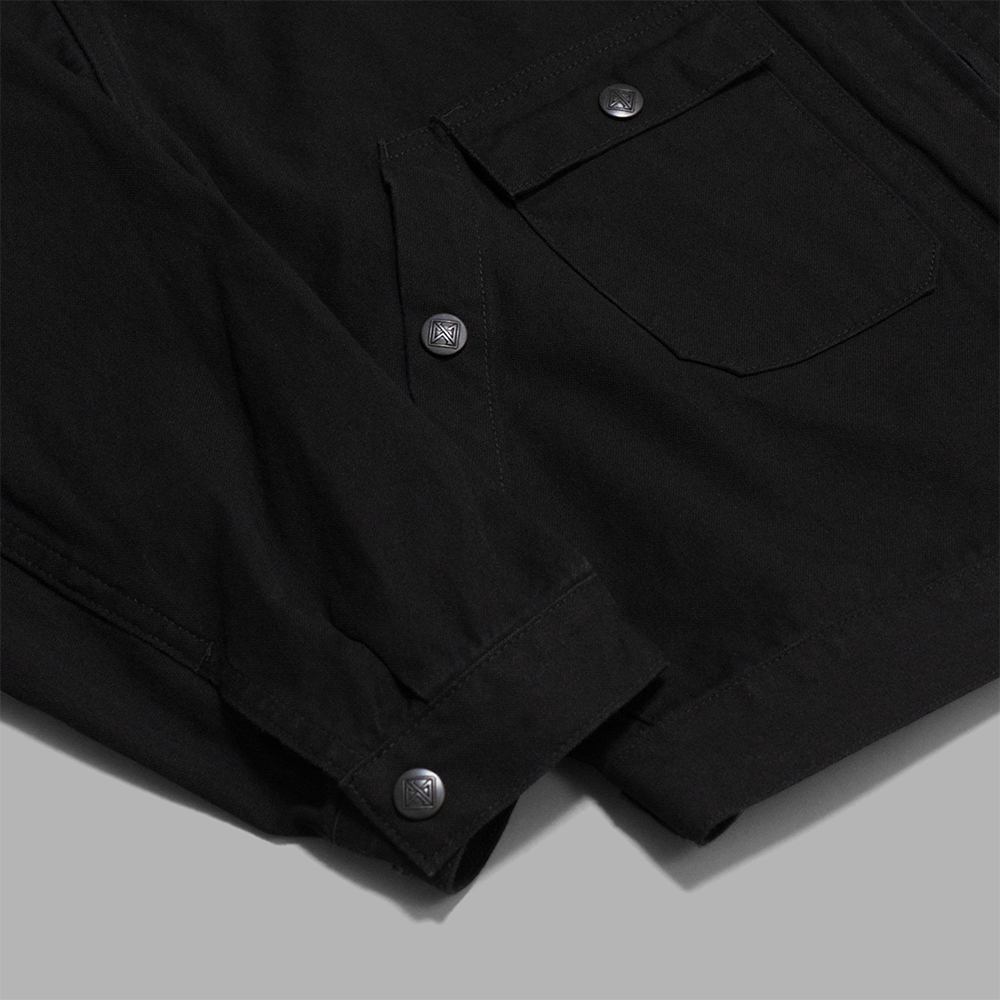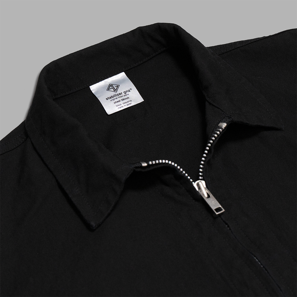 型は、適度にゆとりをもたせたボックスシルエットのジップジャケットです。フロントは通気性や使い勝手を考慮したダブルジップ仕様で、衿裏には着脱可能なチンフラップが付いています。重なり合うように配置された大小のポケットも特徴です。袖口と腰部分にはスナップボタン留めのアジャスターが付きます。中は裏地のない一重の仕様です。