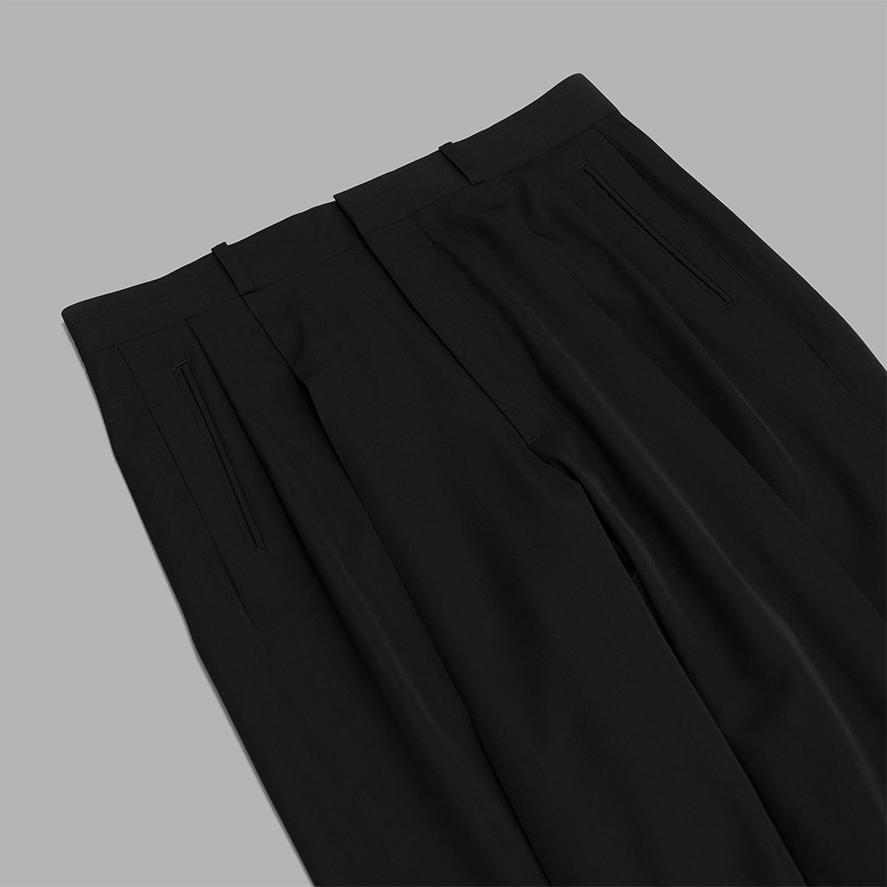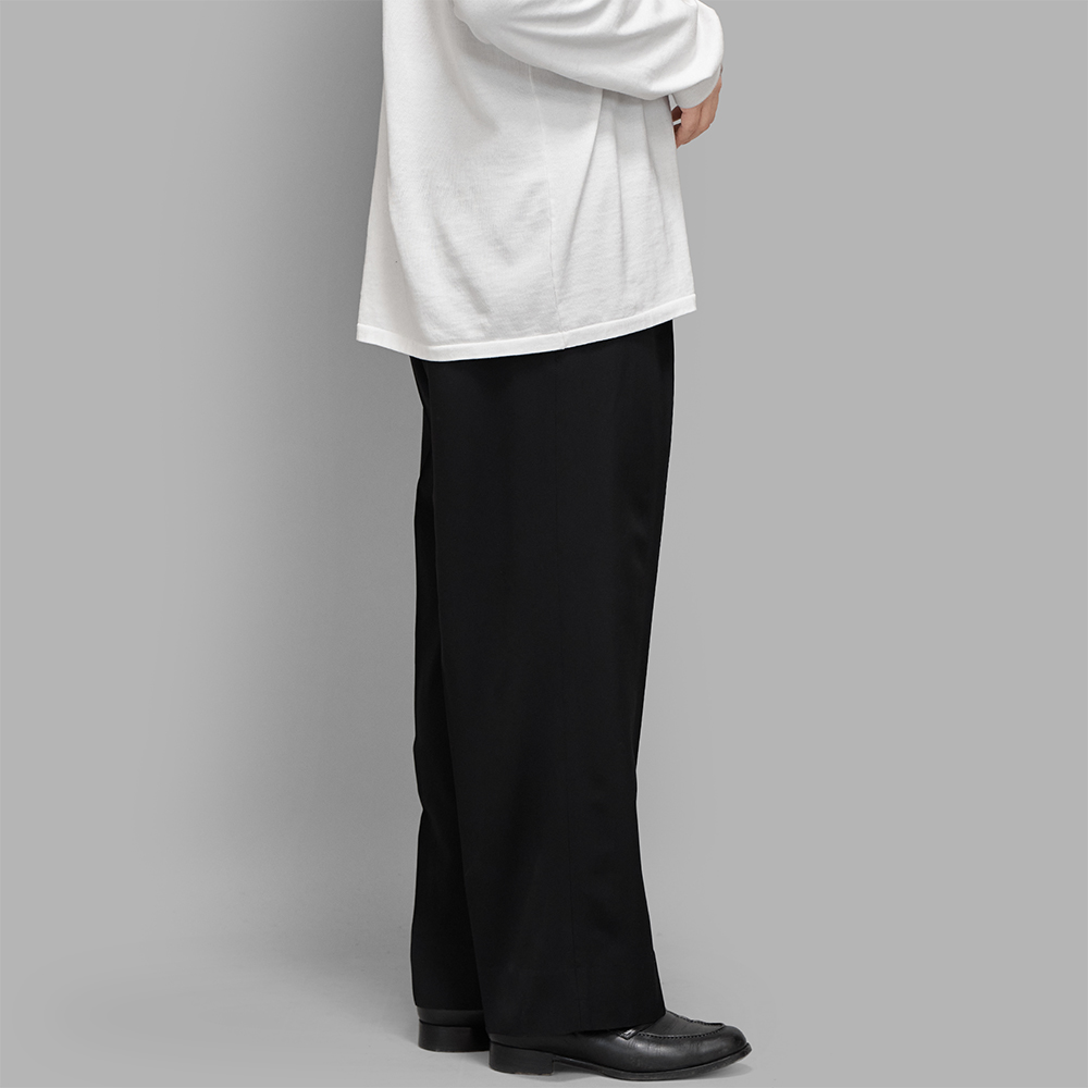 美しいドレープが際立つドレストラウザーで、上質なニットやシャツとの相性はもちろん、同ブランドが展開するヴィンテージ加工を施したトップスとも好相性です。幅広いスタイリングに対応できる一本です。