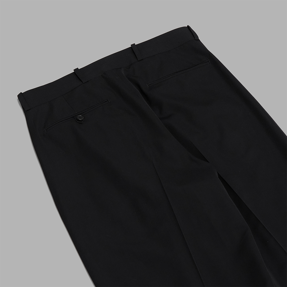 デザインは、50’sのワイドトラウザーをベースにしています。膝下から緩やかにテーパードをかけたワイドシルエットです。ディティールは、4mm幅の細い両玉縁の腰ポケットを施し、ウエストベルトはセンターバックにハギの無い1本ベルト仕様で、ベルトループはベルト幅ギリギリの長さで上下流し込みにしています。ファスナーテープ隠し布やシック等、細部まで丁寧に仕立てられていることも特徴の1つです。フロントファスナーはスイスのririジップを採用しています。裏地はありません。