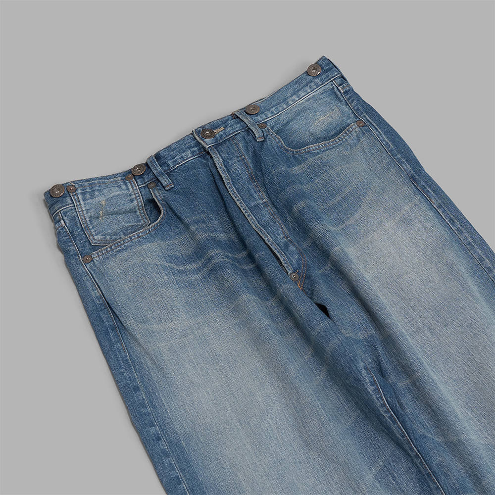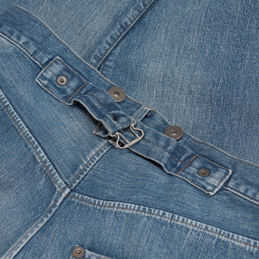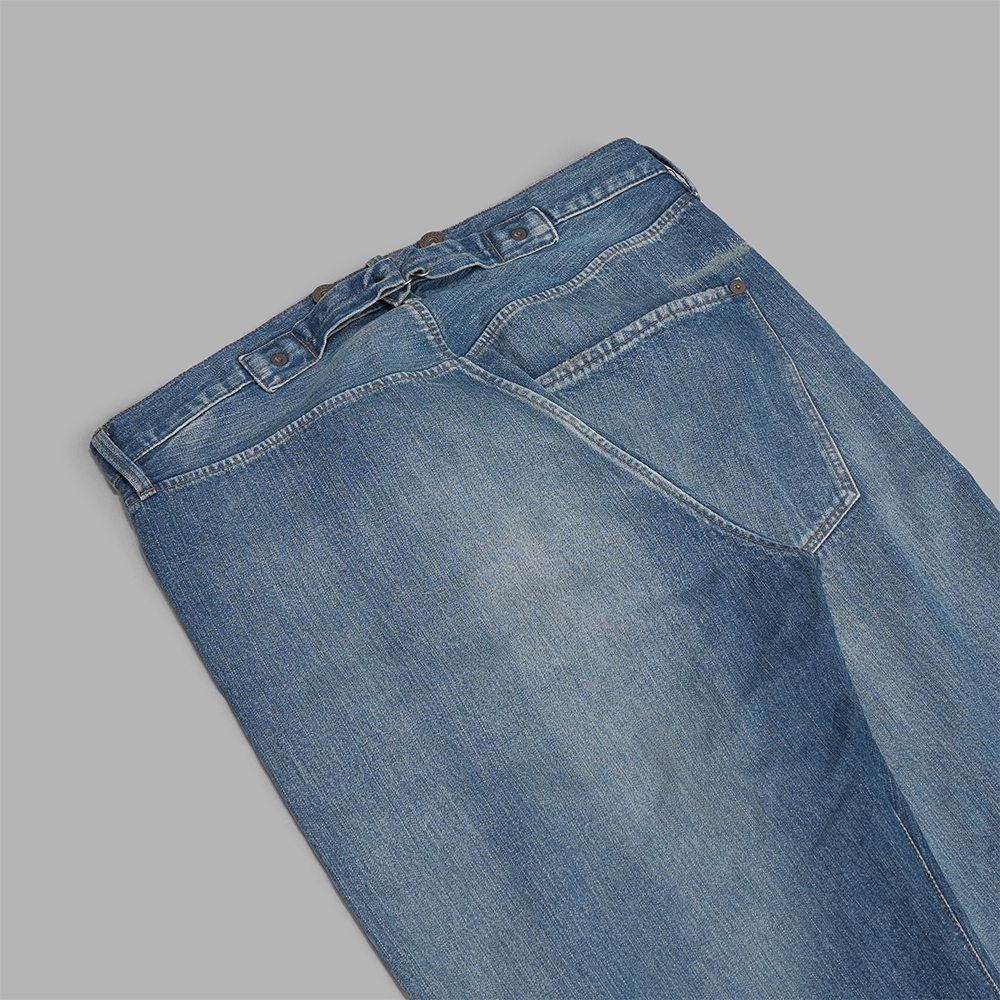 型も当時のワークパンツを彷彿とさせるセミワイドストレートです。ウエストは腰のシンチバックでの調整か、ベルトでの仕様で作られ、ヒップポケットは、片側のみに付けられています。前立てはボタンフライです。