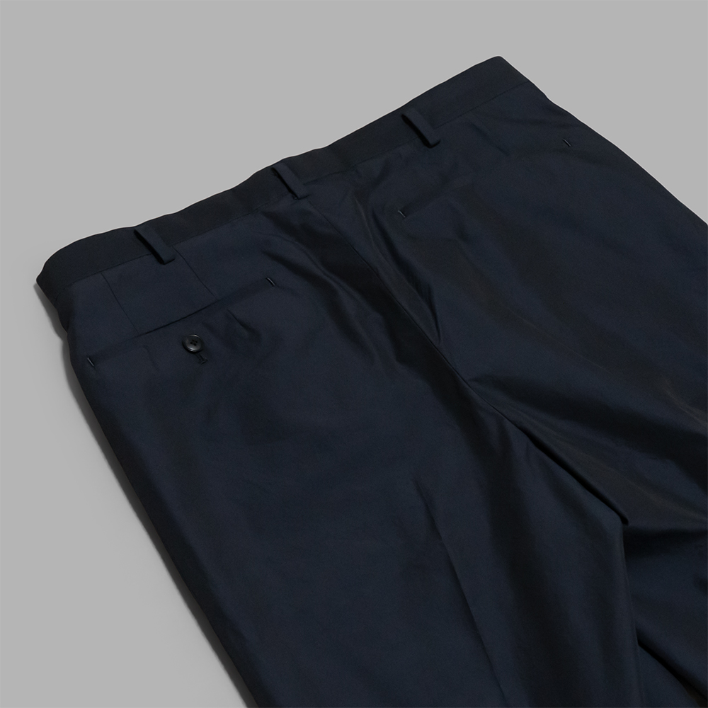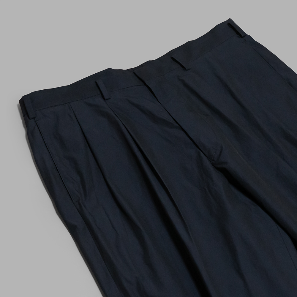 型はポストモダンを背景に生まれた1980年代のDCブランドのボトムスをベースに、当時のハイウエストで腰回りをフィットさせたクラシックなフォルムに仕上げています。前から見るとスッキリと、横から見るとたっぷりとしたワイドシルエットで、タイトすぎずルーズすぎない絶妙なバランスで作られています。