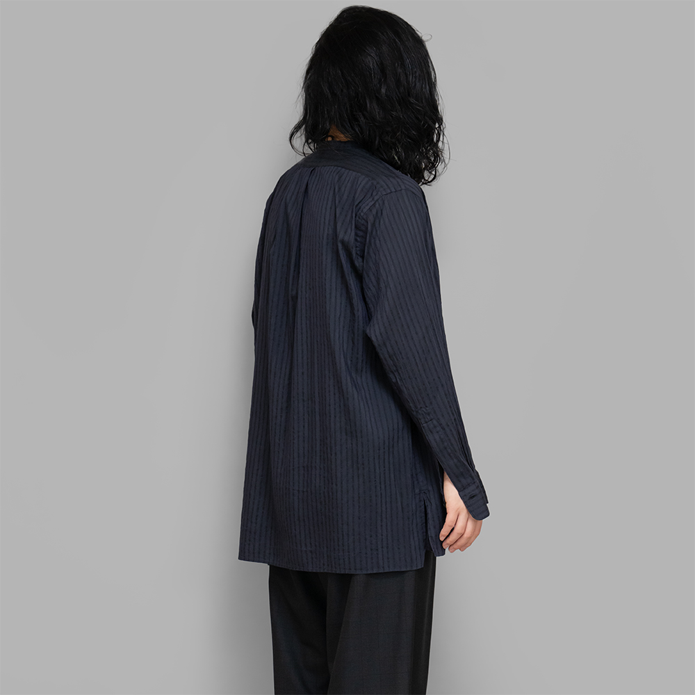 型は1920年代のフランスのイブニングシャツをベースに新しいシルエットのバンドカラーシャツを再構築。サイズバランスは肩や身頃を広めにとってゆったりしたシルエットに仕上げています。裾はフラットでスッキリした印象に仕上げ、サイドにスリットを入れて動きをもたせています。