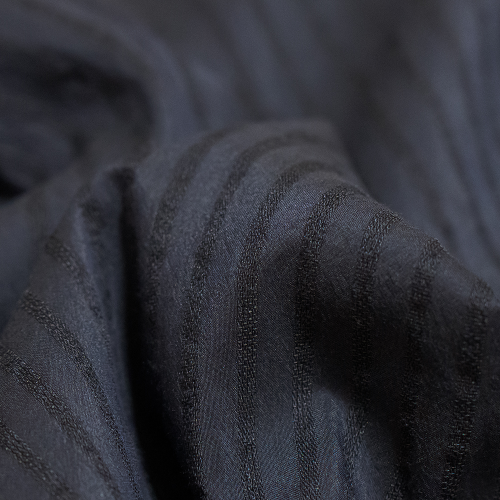 イタリアのファブリックメーカーが手がけたシルク・リネン・コットンのジャガード素材を使用しています。薄手で軽く、サラッとした質感ですが、ストライプのジャガード織によって、清涼感だけではなく、雰囲気のある生地に仕上げています。
