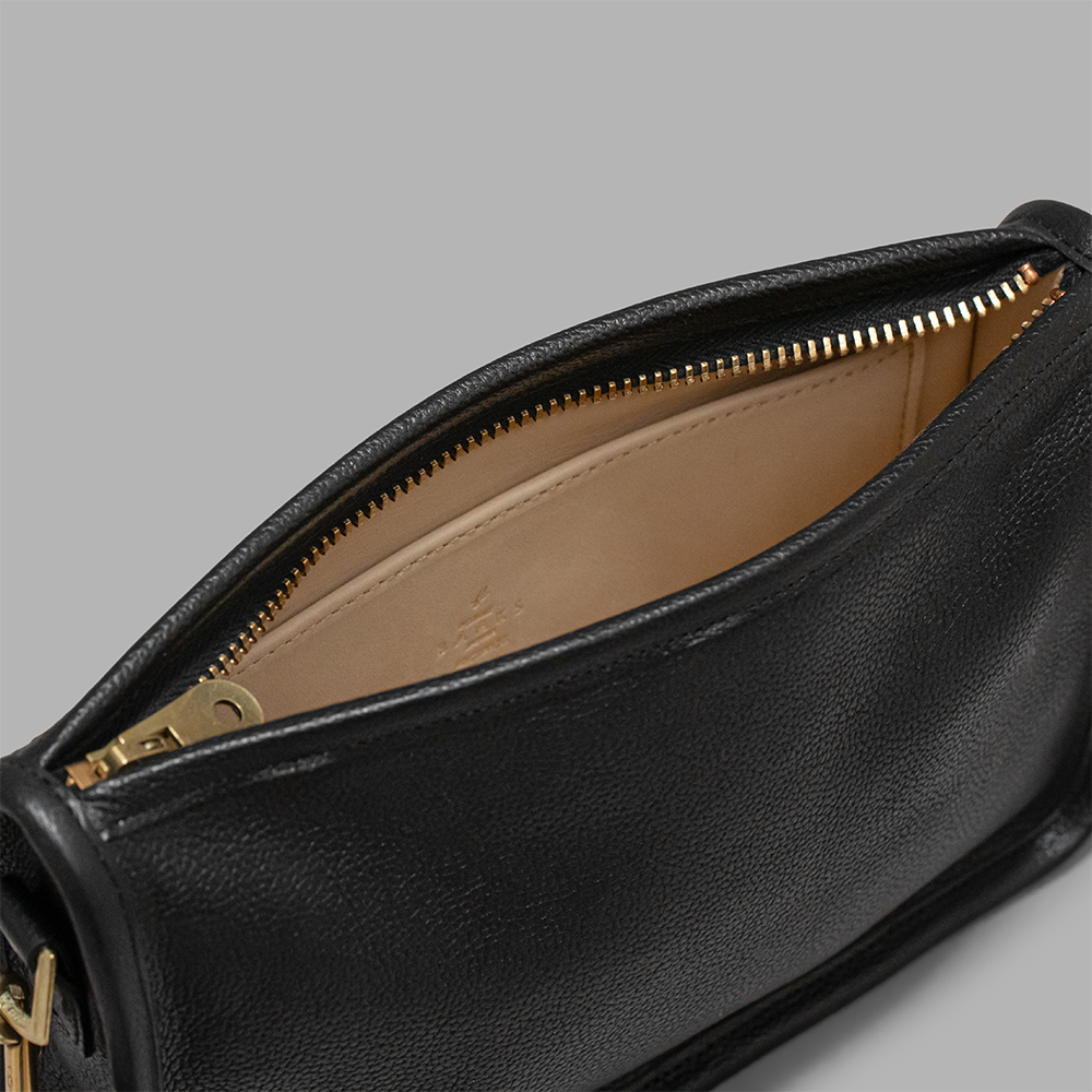 また、アンライニングで作られることも多いクラッチ型のショルダーバッグですが、こちらはホースのヌメ革のライニングがしっかり付けられていることもポイントです。表のコバ部分も全て革で包み込むバインダーの仕様で、丁寧に仕立てています。中は内ポケットが1つ付きます。