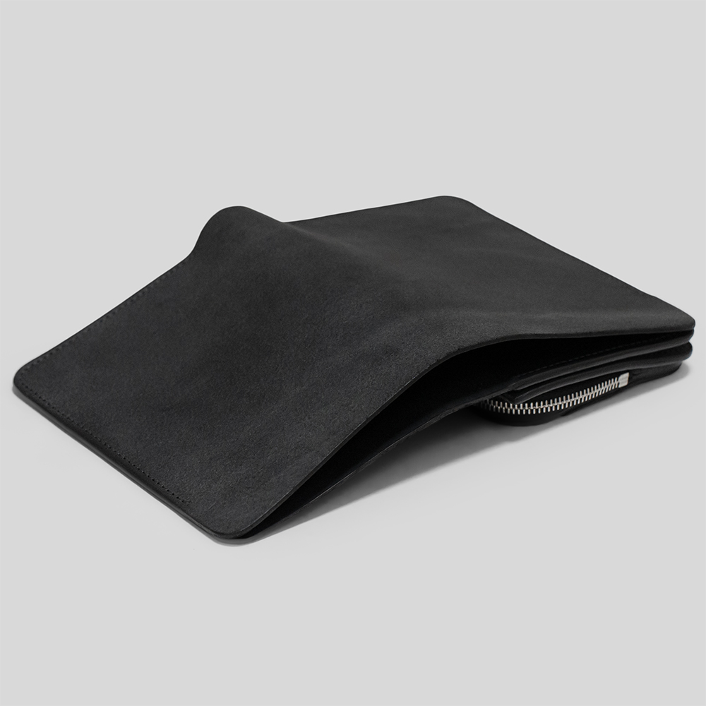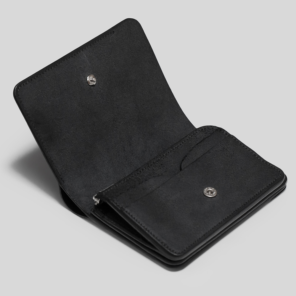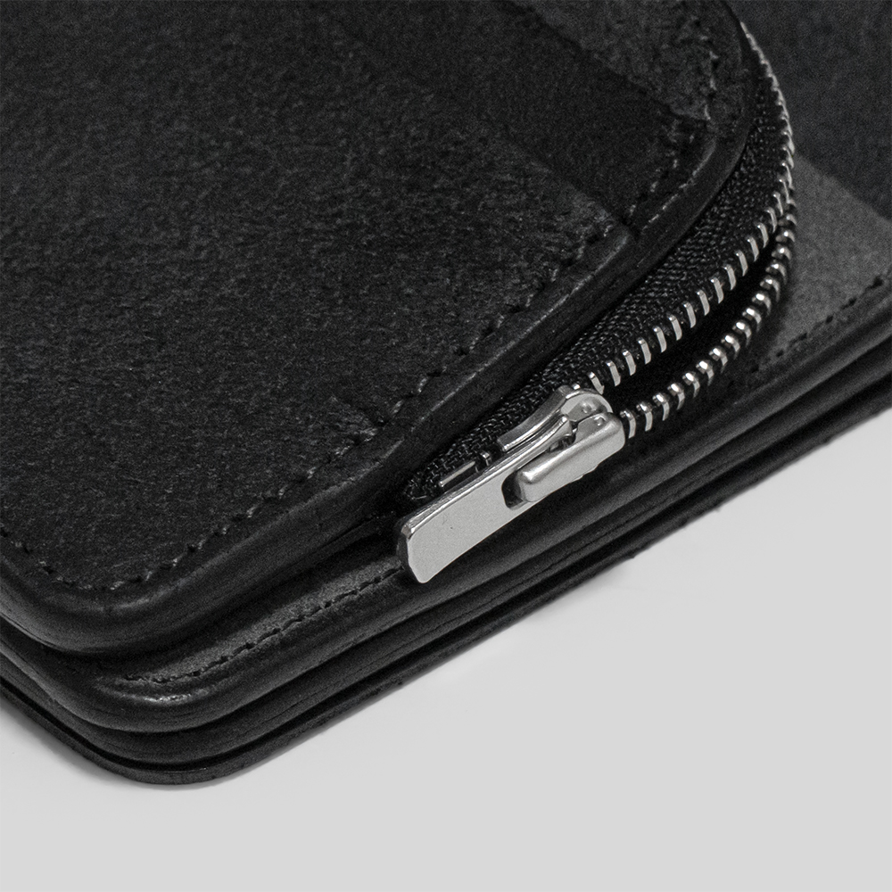 中はお札を折らずに収納できる札入れ、マチ付きの小銭入れ、カードポケットが付けられています。コンパクトなサイズ感ながらも、利便性も兼ね備えています。刻印はありませんが、ジップはすべりがとても滑らかなエクセラジップを使用しています。