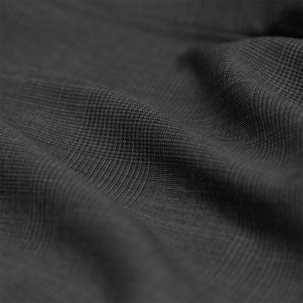 SP100'Sの細番手ウールの強撚糸を用いて、平織りで織り上げたグレンチェック素材を使用しています。とても軽量で、フィニッシュでカシミアタッチに仕上げた清涼感と滑らかさを併せ持つ素材です。