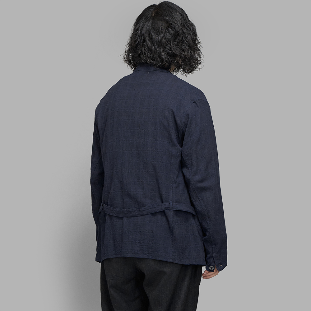 手紡ぎ・手織りのカディコットンに草木染めを施したジャカードチェック生地を使用しています。特殊な手織りジャカード織機を用い、ドビー織りや絡み織りなど多様な技法を織り交ぜて奥行きのある独自のチェック柄を表現しています。