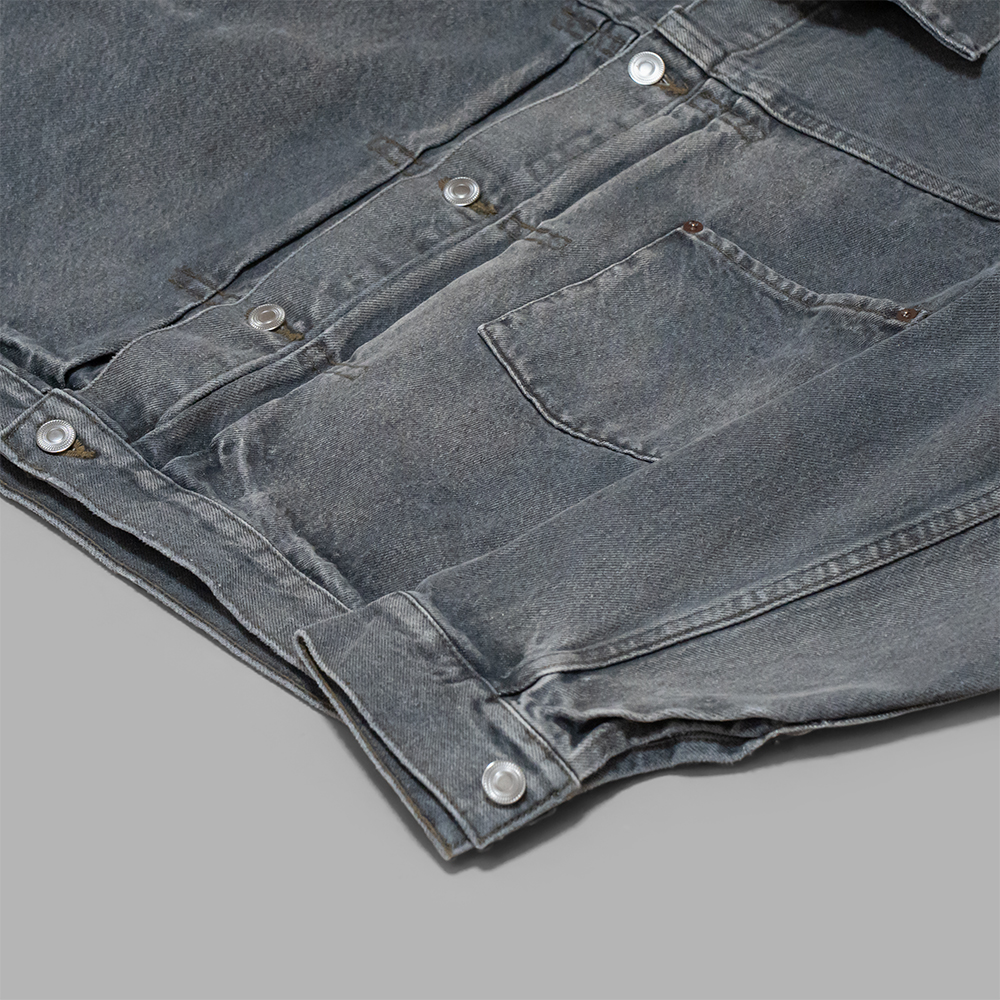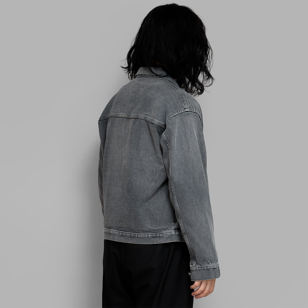 後身頃はタックやシンチバックルを省いた、すっきりとした印象です。加工は、ブラックデニムがグレーへとフェードしていく過程を表現しており、シミや汚れによるムラのある経年変化も特徴です。