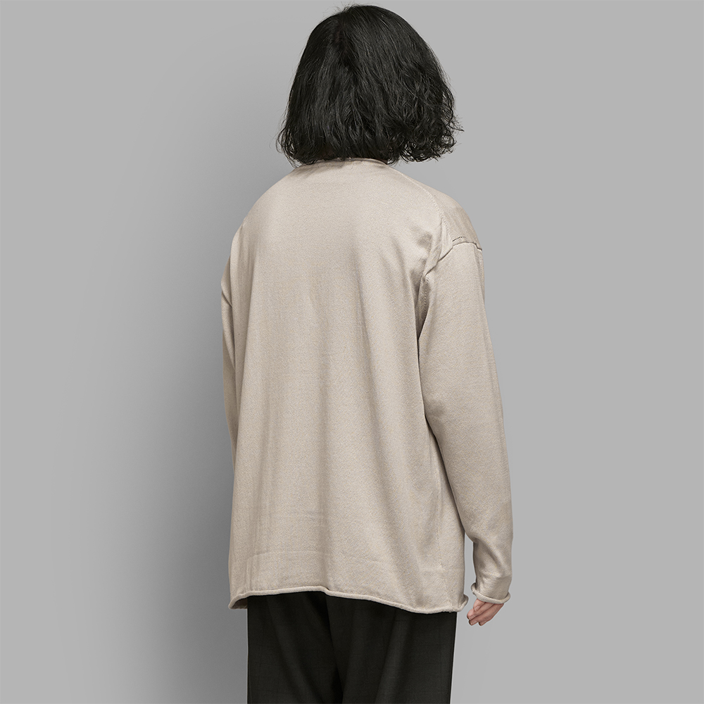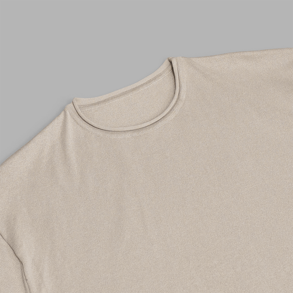 デザインはシンプルなクルーネックですが、首元や袖、裾口をロールさせることでデザインを持たせています。サイズ感はメンズでのフリーサイズで、全体的にゆったりとしたバランスで設定されています。