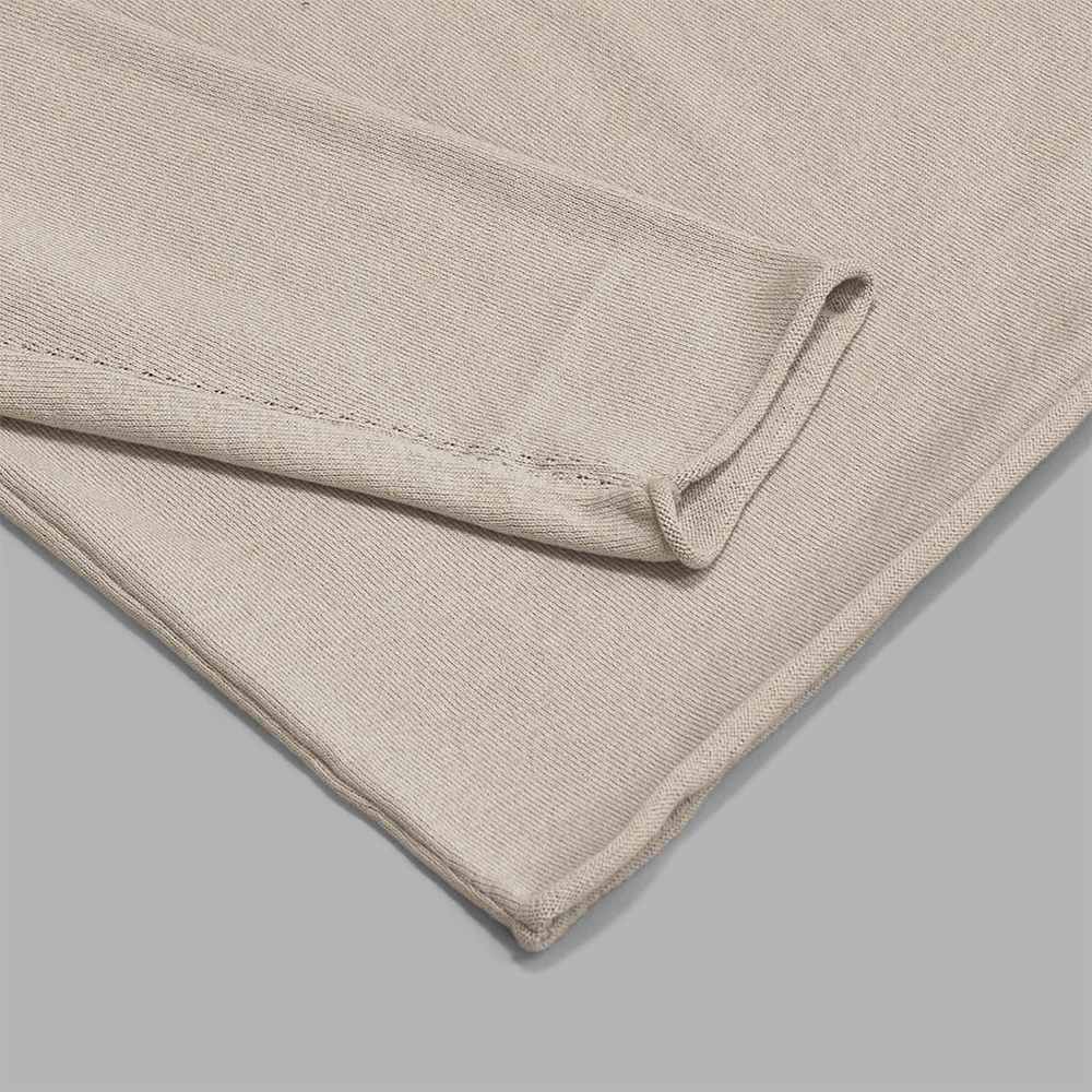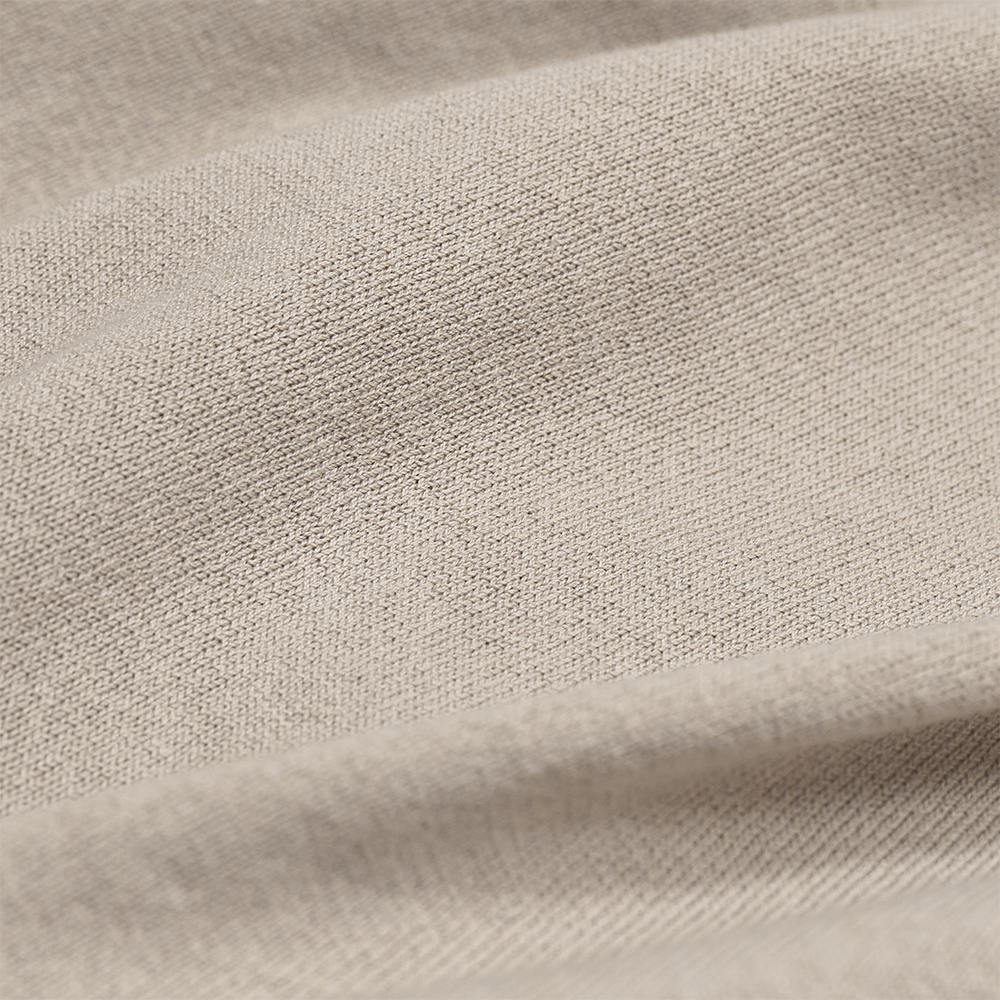素材は、スーピマコットンとシルクの混紡糸を使用しています。通常より撚糸回数を増やし、糸を引き締めることで、毛羽がなく、程よく密度のある生地に仕上がっています。加えて、撚糸した糸は肌に接する面積が抑えられるので、気温の高い日でも快適に着用いただけます。