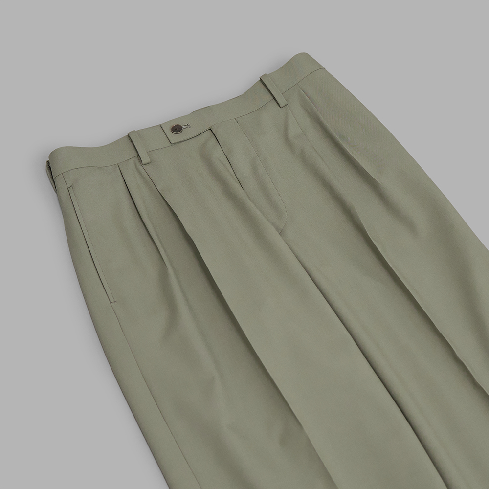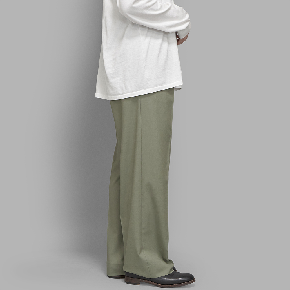 型は、腰回りにツータックを入れ、ゆとりのある着用感に仕上げたトラウザーです。わたり幅も太めに設定し、膝下からわずかにテーパードをかけています。前立てはジップフライ仕様で、裏地は半裏仕立てです。