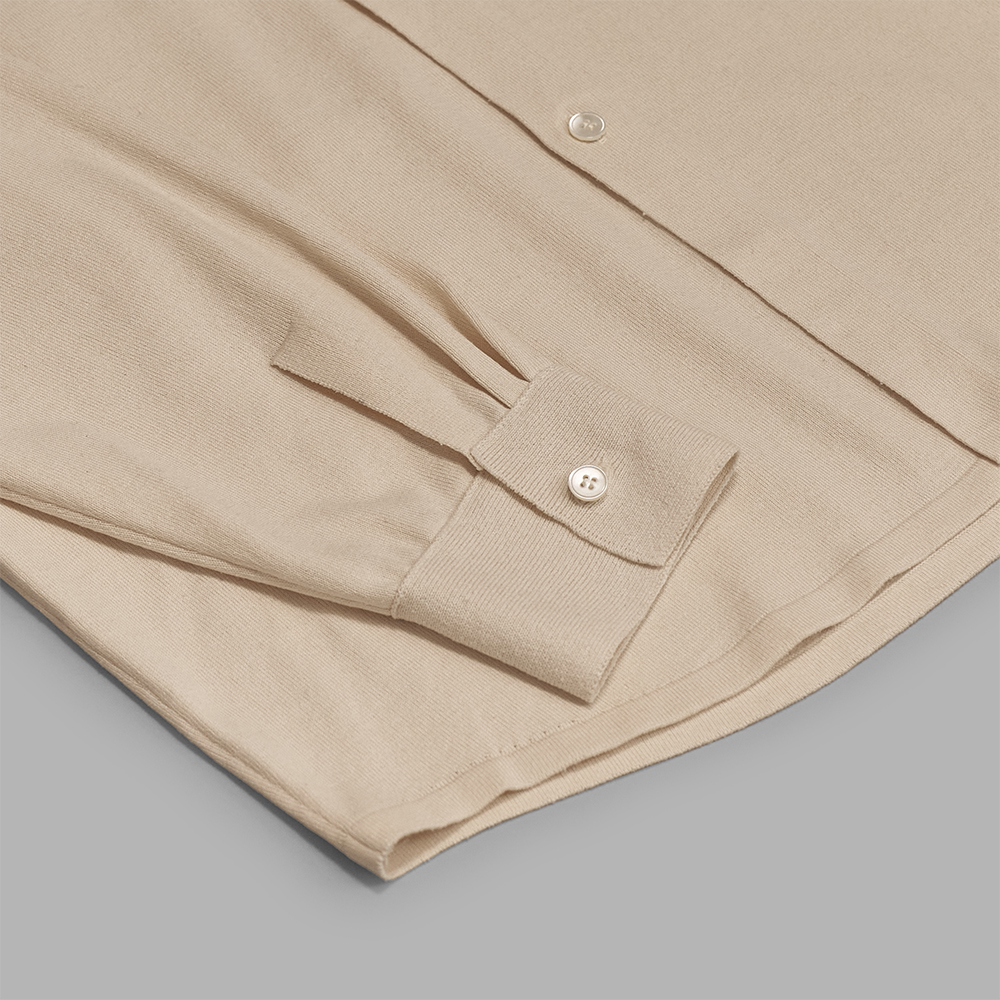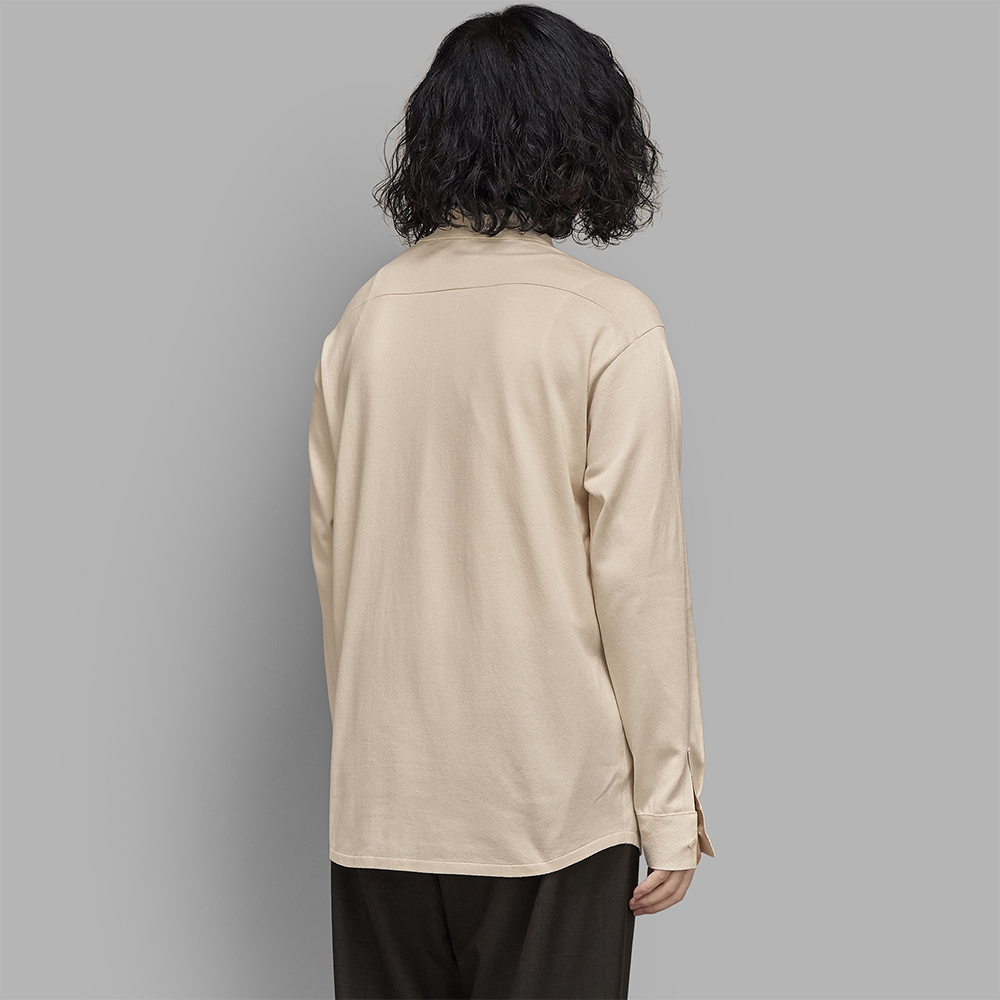 型はニット素材でシャツを仕立てたようなデザインで、全体的にゆとりを持たせたリラックス感のあるバランスです。裾にはリブを設けないことで、着用時にシャツのように落ち感がでてくれます。