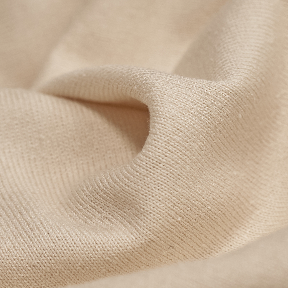 シルクの紬糸を用いて18ゲージで限界まで度詰めして編み上げ、さらっとした風合いと柔らかさを兼ね備えたニット素材を使用しています。ガス焼き加工を施した細番手のシルク紬糸を使用することで、紬糸ならではの素朴な表情を残しながらも、クリアな目面に仕上げています。