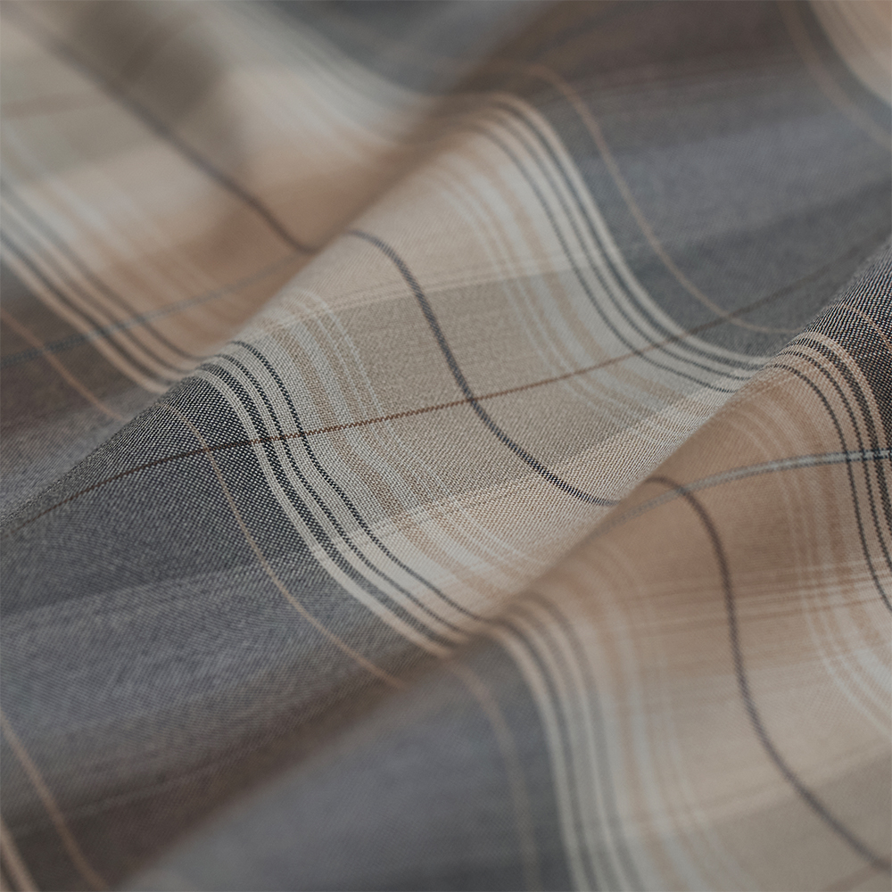 Super120'sの超極細番手のウール梳毛糸を多彩な色に染め分け、しっかりと織り上げた撚り杢ウールチェック素材です。程よくハリのある綺麗な生地の落ち感と、ひんやりと滑らかな風合いが特徴です。
