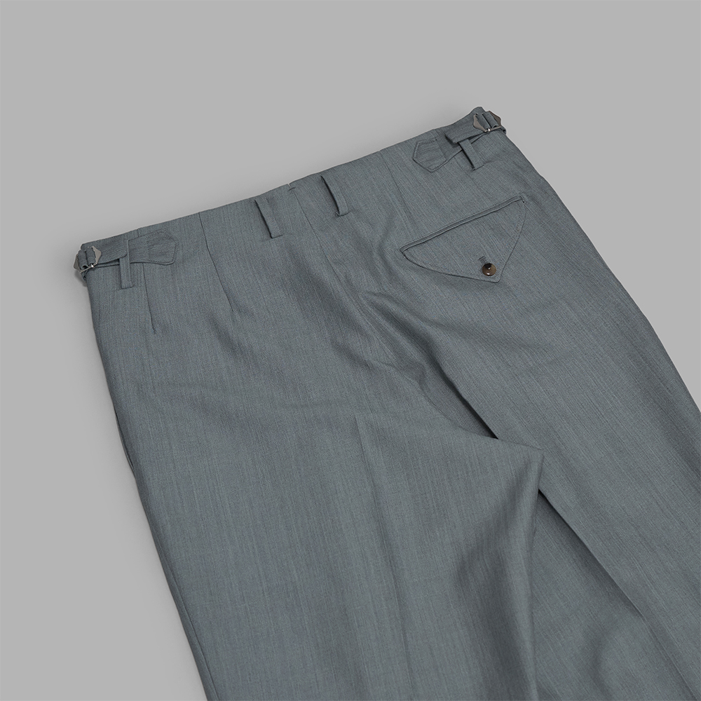 型は、一般的なフレアパンツに比べ、膝下から裾にかけて、微かに広がりを感じられる、微フレアのシルエットになります。また、ツータックにすることで、腰回りにもゆとりが生まれ、全体的にリラックス感のあるシルエットに仕上げています。腰にはサイドアジャスターが付き、前立てはジップフライで中は半裏の仕様です。