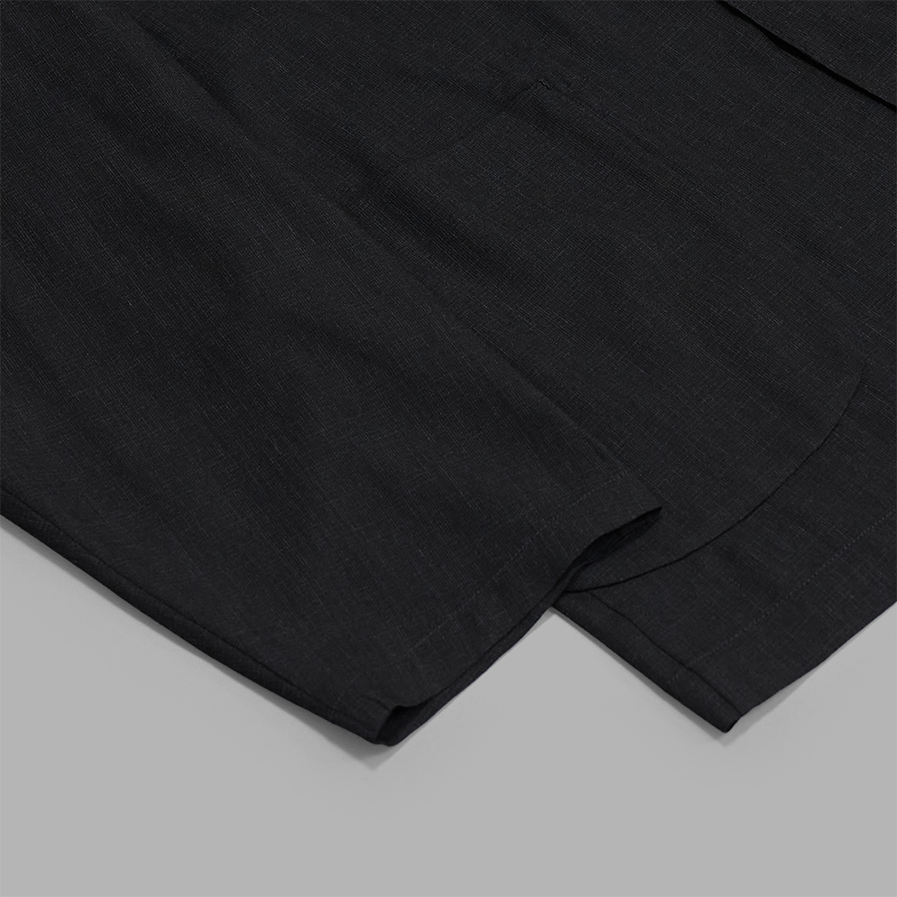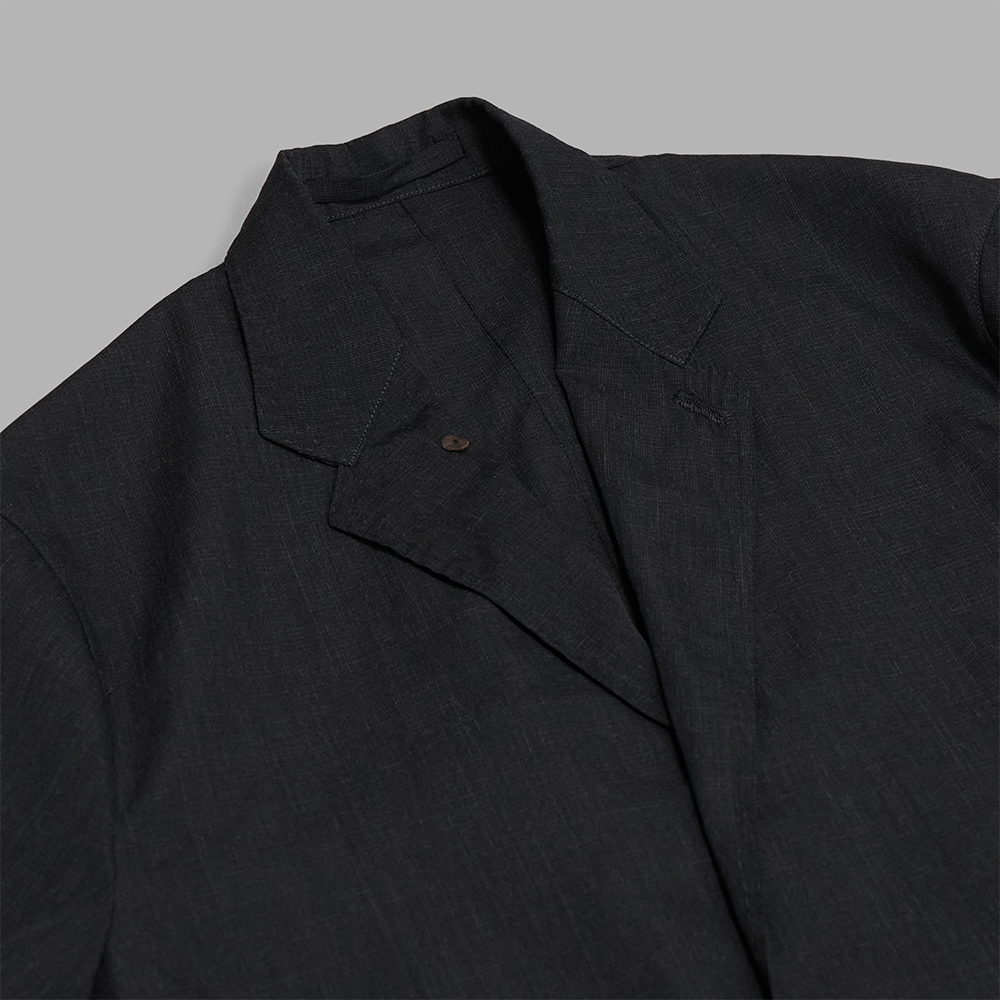ラペルから前端にかけて施された二重のハンドステッチや手まつりの力布、ボタンホールに至るまで随所に手仕事が施され、味わいのある仕上がりです。薄く軽やかな着心地ながら、細部の作り込みや奥行きのある生地感が際立つ一着です。同生地のボトムスも展開されており、セットアップであわせることもできます。