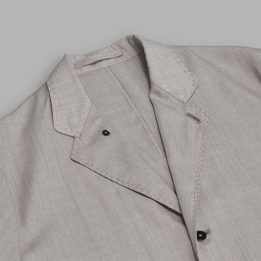 ラペルから前端にかけて施された二重のハンドステッチや手まつりの力布、ボタンホールに至るまで随所に手仕事が施され、味わいのある仕上がりです。薄く軽やかな着心地ながら、細部の作り込みや奥行きのある生地感が際立つ一着です。同生地のボトムスも展開されており、セットアップであわせることもできます。
