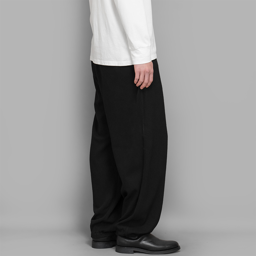 型は、ゆったりしたシルエットの裾リブ仕様のドローストリングパンツです。前立てはジップフライで、ウエストはドローコードだけではなく、ゴムも通しフィット感を高めています。