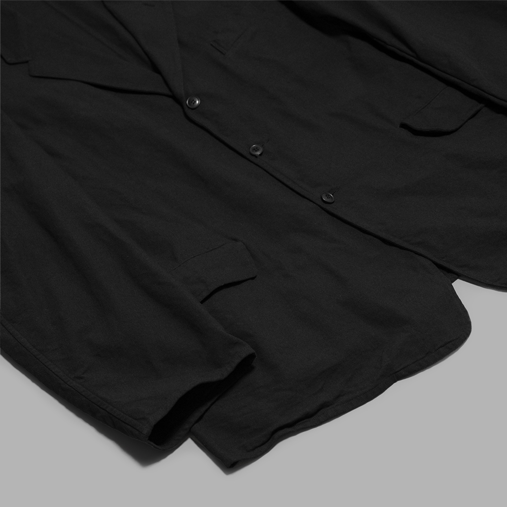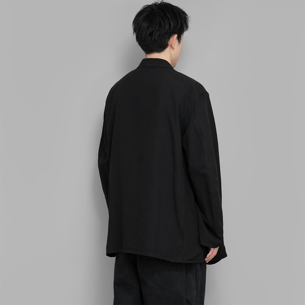 型は、ゆったりしたサイズ感で作製されたテーラーラペルのジャケットです。中は裏地の付かない一重の仕様で、左右の見返し部分に内ポケットを1つずつ付けています。