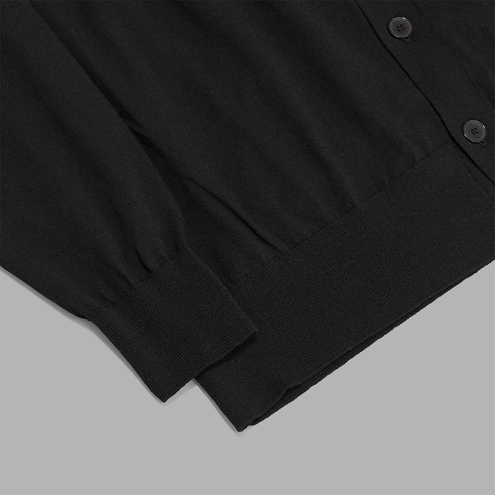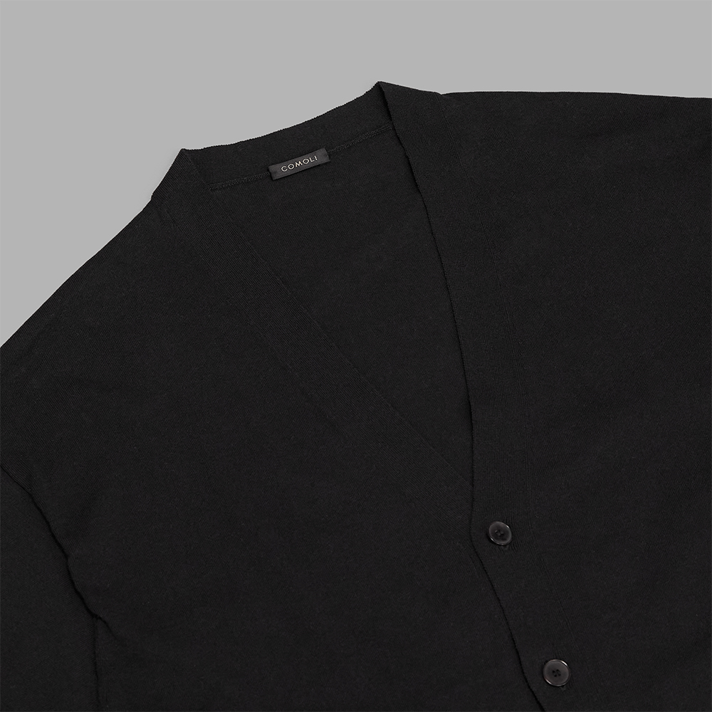 25SSから継続展開されている、軽くてドライな糸で編み立てた18Gのニットカーディガンです。編み地に若干のムラ感があり、ハイゲージでも整い過ぎていない印象にしています。