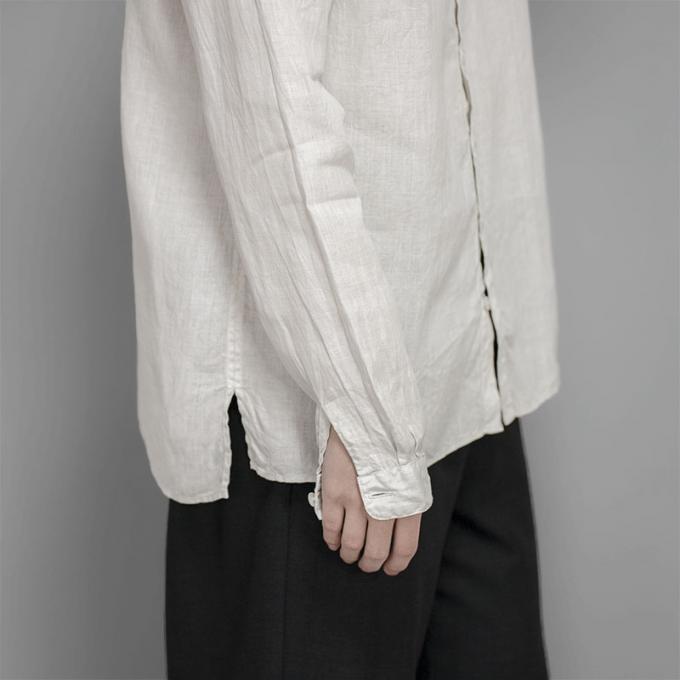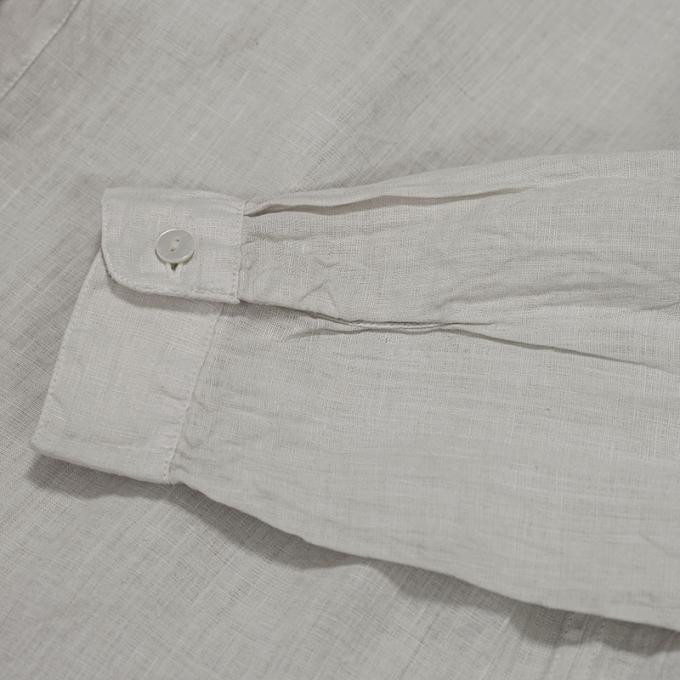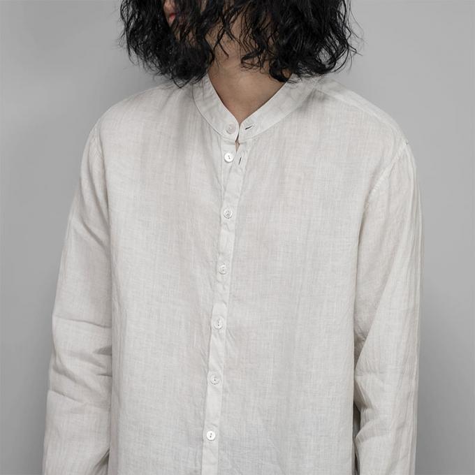 デザインは大麻の素材感との相性が良く、仕立て映えのするスタンドカラーを採用しています。スリットの入るフラットな裾のデザインも相まって、シャツジャケットのような雰囲気も感じます。
