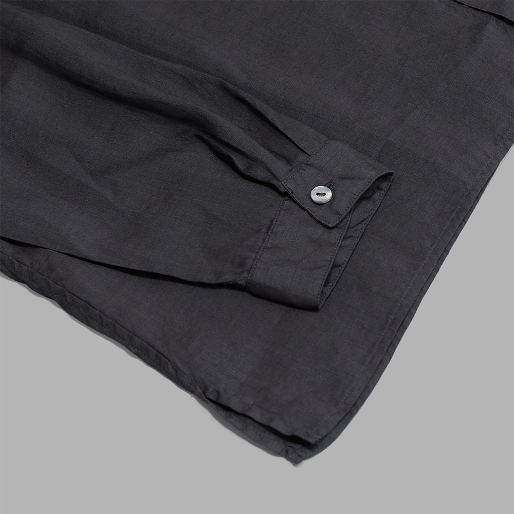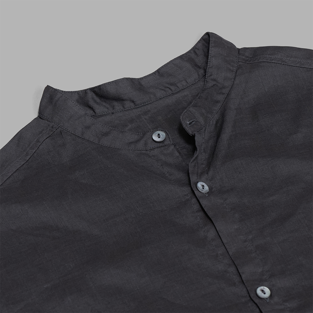 型は、生地の透け感を活かしつつ、日常使いを意識した程よくゆとりのあるシルエットのスタンドカラーシャツです。袖山にはいせ込みを入れて運動量を確保し、脇にはスリットを設けるなど、機能性を備えながらもシンプルなデザインに仕上げています。切り込みを入れないカフスや、ヨークを設けずに折り伏せ縫いで肩を縫い合わせることで、繊細な生地への負担を抑えています。ボタンには貝ボタンを使用しています。