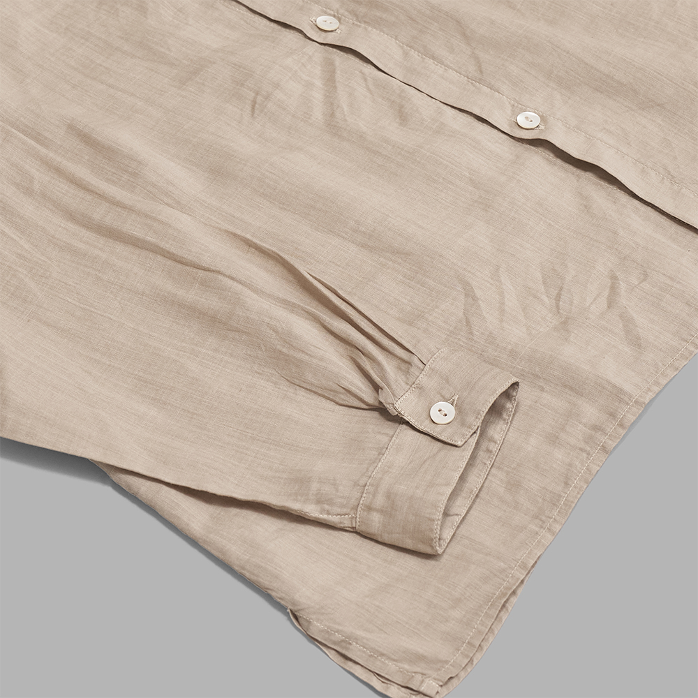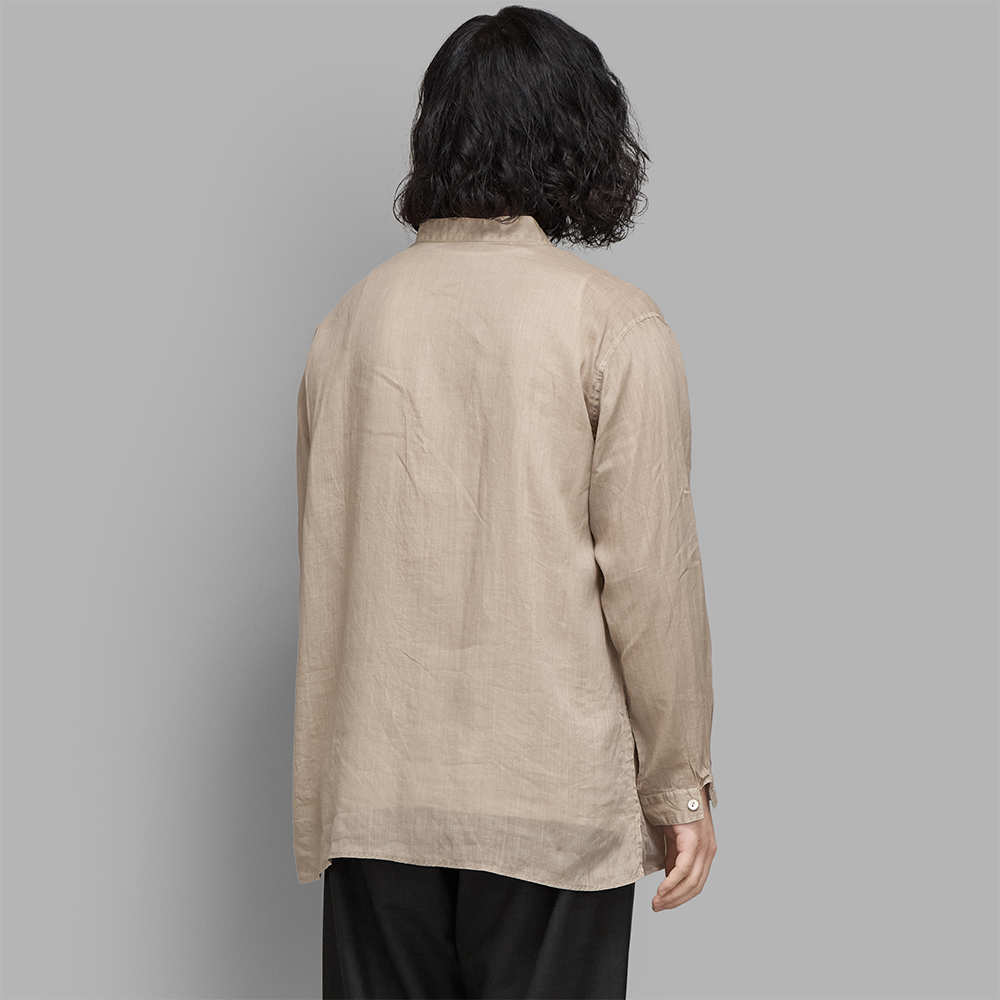 型は、生地の透け感を活かしつつ、日常使いを意識した程よくゆとりのあるシルエットのスタンドカラーシャツです。袖山にはいせ込みを入れて運動量を確保し、脇にはスリットを設けるなど、機能性を備えながらもシンプルなデザインに仕上げています。切り込みを入れないカフスや、ヨークを設けずに折り伏せ縫いで肩を縫い合わせることで、繊細な生地への負担を抑えています。ボタンには貝ボタンを使用しています。