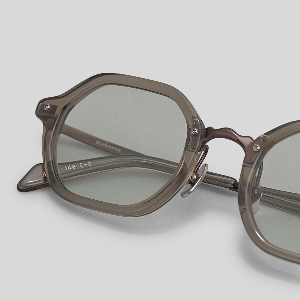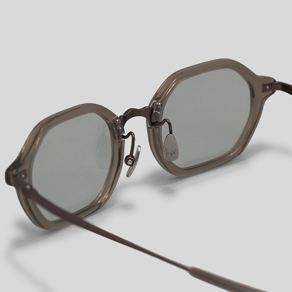 型は、六角形をベースに、角を程よくラウンドさせ、天地幅やフレーム幅を微調整することで、柔らかな印象の中にも、シャープな雰囲気を感じられるデザインです。