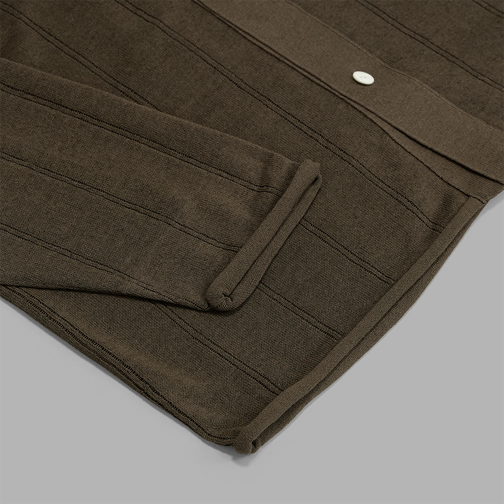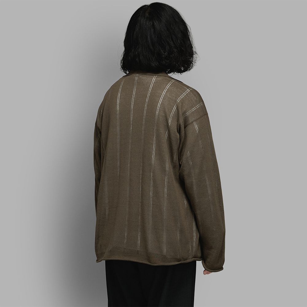 透かし編みによるストライプ柄はインナーに合わせるトップスによっても表情を変え、ミニマルなデザインの中に品の良さを感じます。ニット素材ではありますが、リネンシャツのような軽さと空気の通りが良い透湿性のあるシャツカーディガンは、春夏を通して着用しやすいアイテムです。