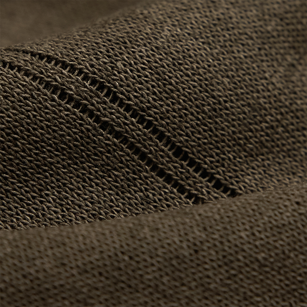 シルクでありながら、アイテム名の通りジャリっとしたドライなタッチに仕上げたニット素材を使用しています。ニット素材としてはとても薄く編み上げつつ、糸の弾性によって着用時に落ち感だけでなく、膨らみが出るような絶妙なバランスを感じられる素材です。