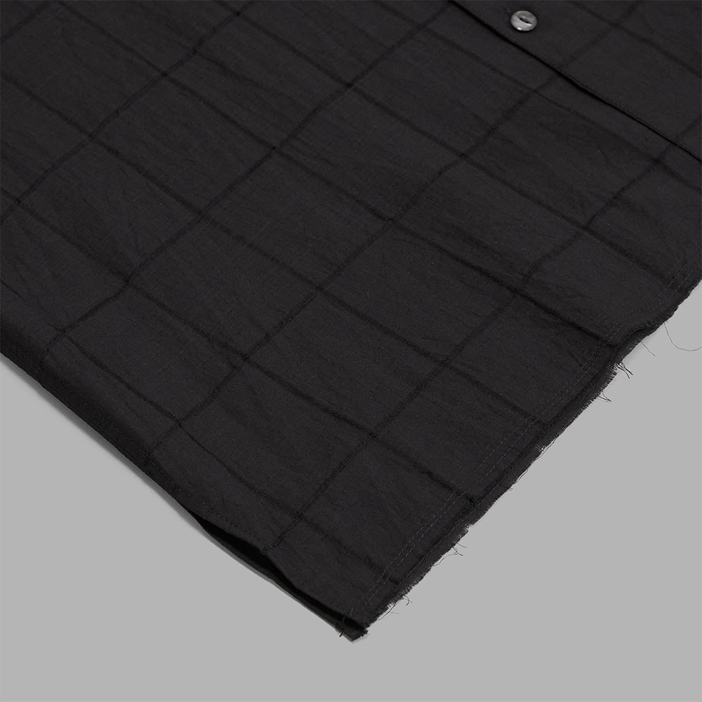 素材は、150番手の極細手紡ぎ手織りのカディ生地を使用しています。柔らかでスムースとしたタッチでありながら、ネップ感が残る手仕事ならではの表情豊かな素材です。その生地を、4ミリのラインを手で1本ずつ糸を抜きチェックを表現した究極に繊細な仕上がりです。