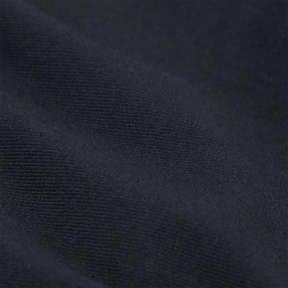 生地は空気紡績した糸を使用した天竺素材です。空紡糸は糸の外側に強い撚りがかかり、内側には撚りがかかってないため、軽く、肌当たりはドライタッチで湿気の多い日本の夏でも快適に着用することができます。