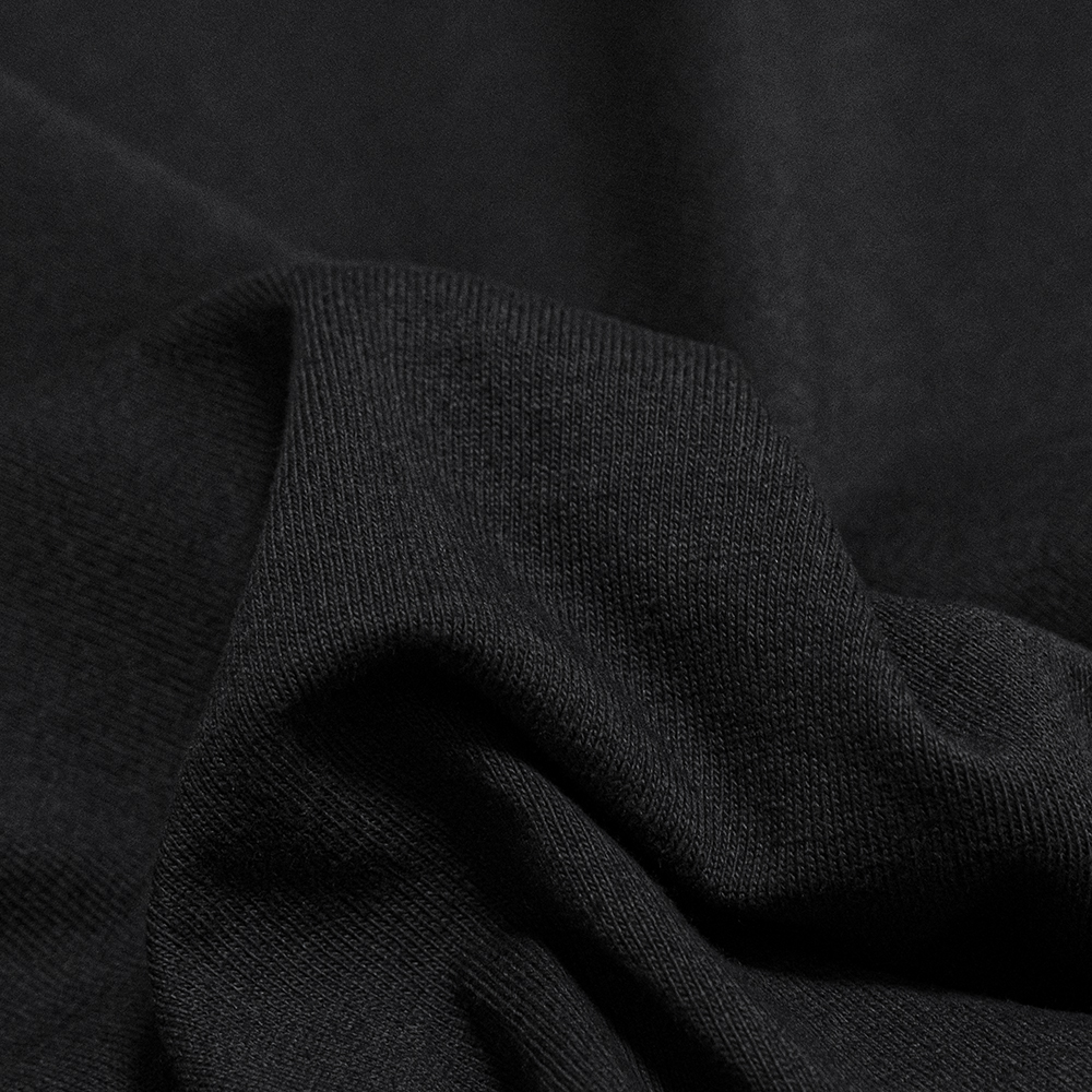 超長綿の中でもとくに繊維が長く綺麗で希少価値の高いコットンの落ち綿と、インド産のオーガニック超長綿をブレンドし、太番手で空紡引きした糸で編み立てた天竺を使用しています。空紡糸は糸の外側に強い撚りがかかり、内側には撚りがかかってない為、軽く、肌当たりはドライタッチで湿気の多い地域でも快適に着用できることが特徴です。