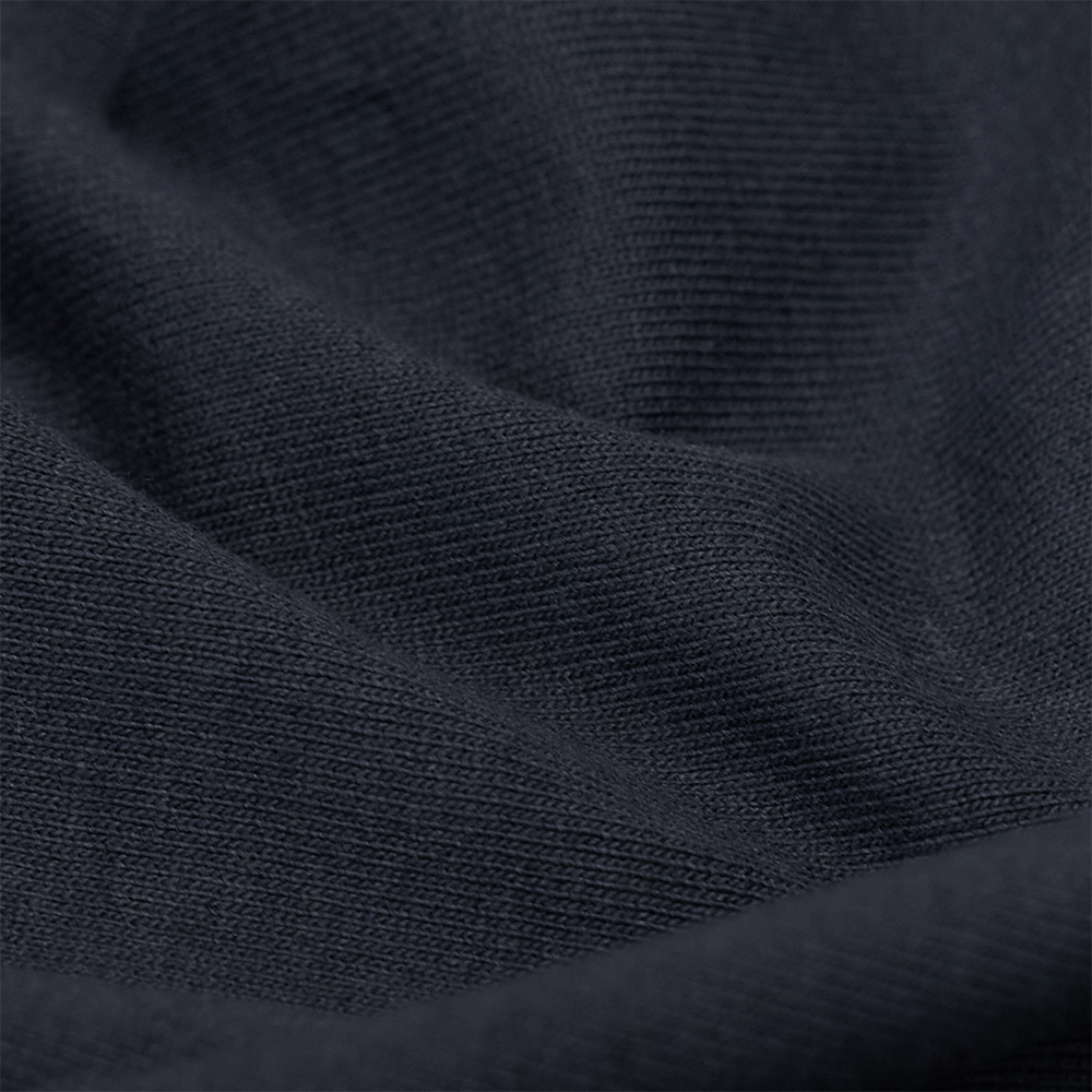 超長綿の中でもとくに繊維が長く綺麗で希少価値の高いコットンの落ち綿と、インド産のオーガニック超長綿をブレンドし、太番手で空紡引きした糸で編み立てた天竺を使用しています。空紡糸は糸の外側に強い撚りがかかり、内側には撚りがかかってない為、軽く、肌当たりはドライタッチで湿気の多い地域でも快適に着用できることが特徴です。