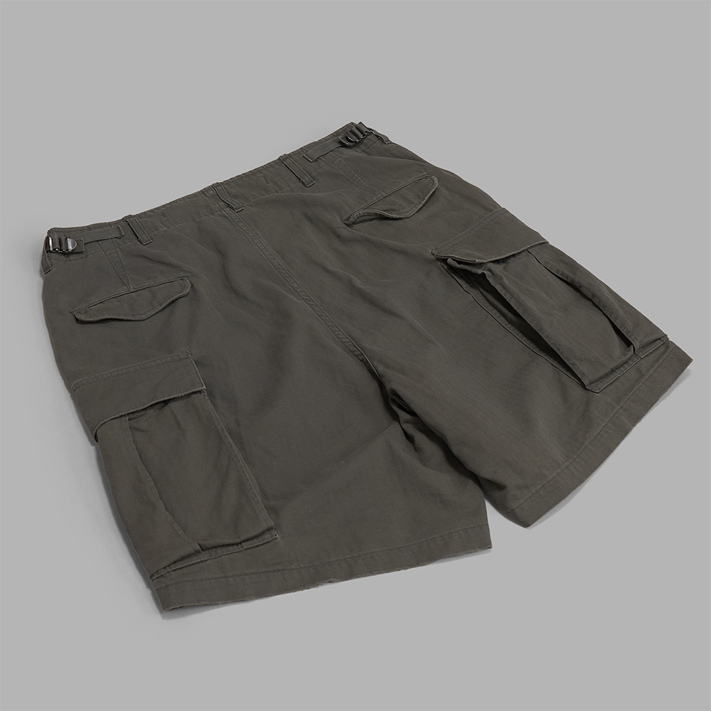 型は、アメリカ軍のM51のショーツバージョンで、サスペンダー釦や止血帯のサイドストラップは排除し、極太のシルエットも程よい太さへ履きやすくアップデートしています。前立てはジップフライです。
