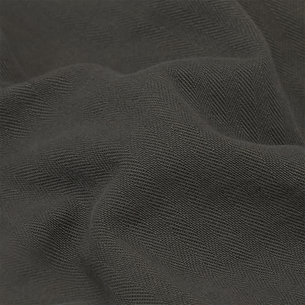 生地は、経糸に綿の中太の単糸、緯糸には綿のムラ糸を使用し、広すぎず狭すぎないヘリンボーンのパターンピッチを採用しています。硫化染料で深いOLIVEに染めた後に、ヴィンテージ加工を施し、緯糸のムラ糸が自然なヴィンテージ感が出る様に仕上げています。