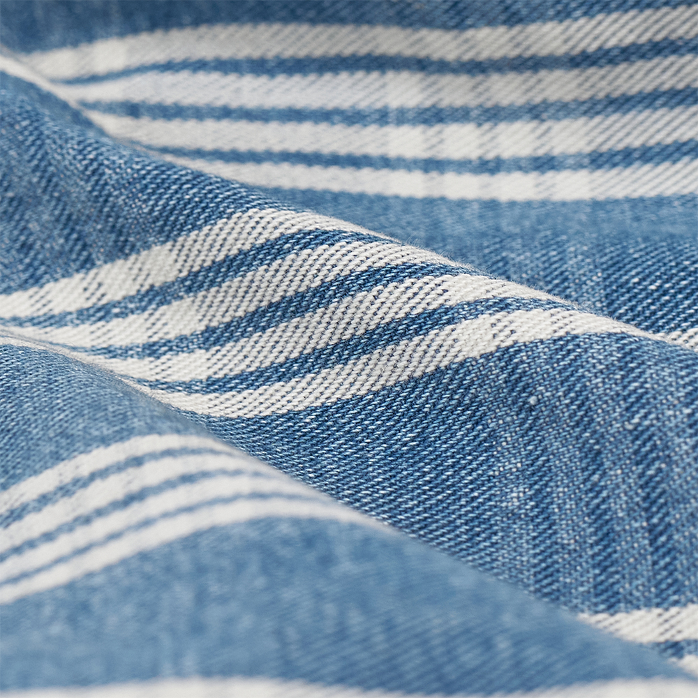 ロープインディゴ染めしたムラ糸と生成りのムラ糸を使用して織り上げたパラカチェックデニムです。不均一なムラ形状を、複数種の異なる形状の糸をミキシングして織ることで表現しています。生地に硬さはなく、11ozのライトオンスのため、Tシャツの上からさらっと羽織れる軽やかなデニム地になります。