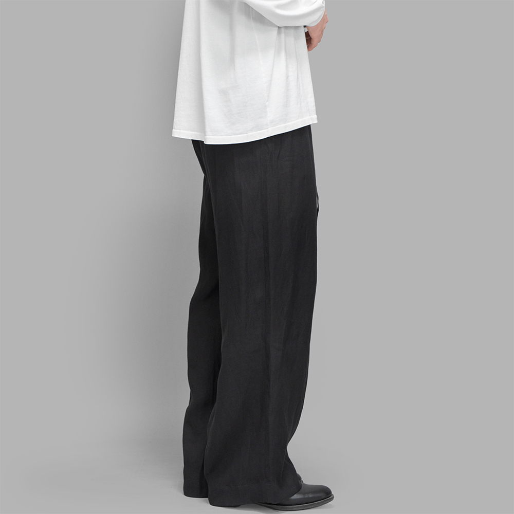 型は、同ブランドで定番で展開されているTucked Baggy Pantsに、パンツと同生地のベルトを配した26SSの新型です。ベルト無しでの着用もは勿論のこと、 ベルトを付けることでエレガントな雰囲気と、ワークパンツのようなカジュアルなニュアンスをお楽しみいただけます。前立てはジップフライで、裏地のない一重の仕様です。